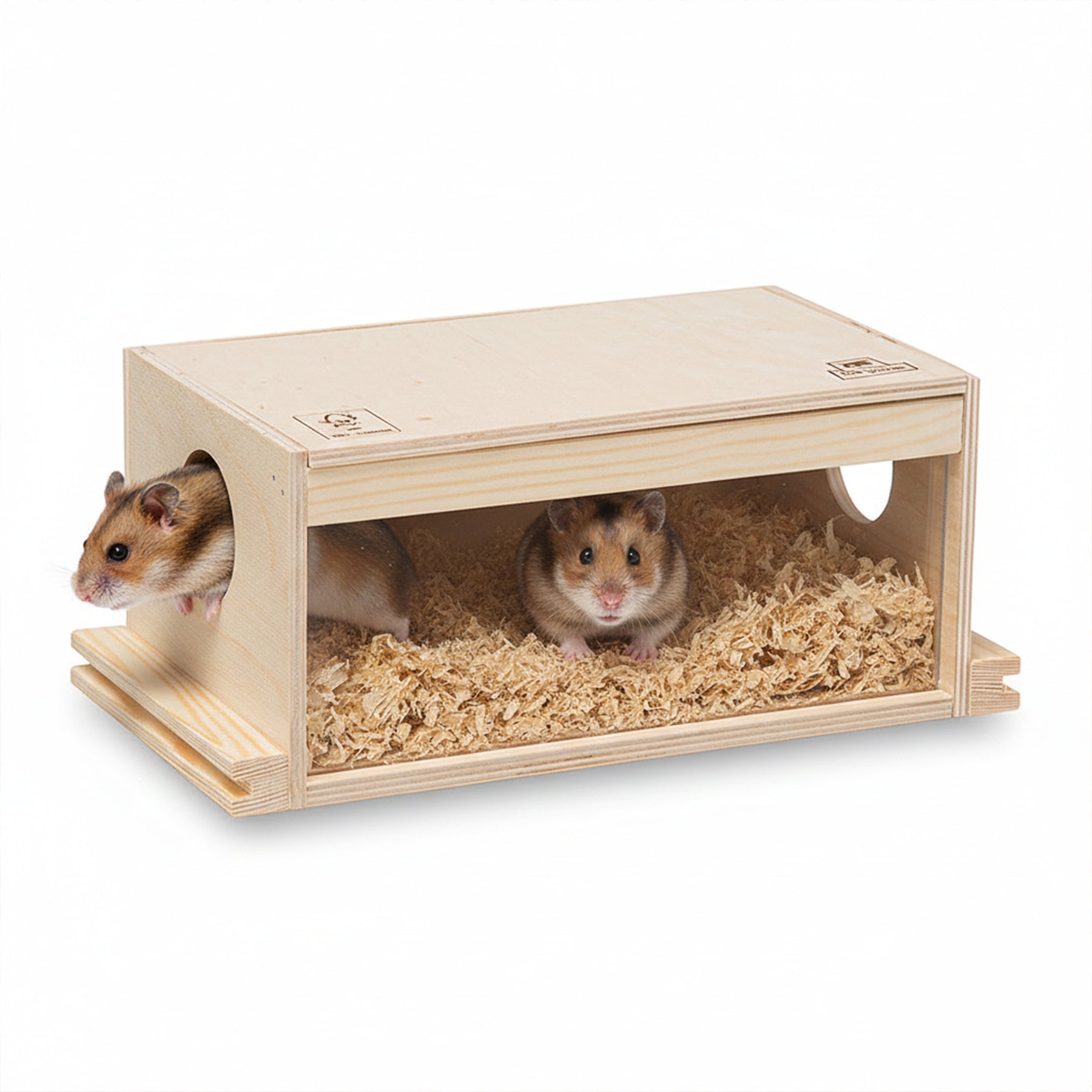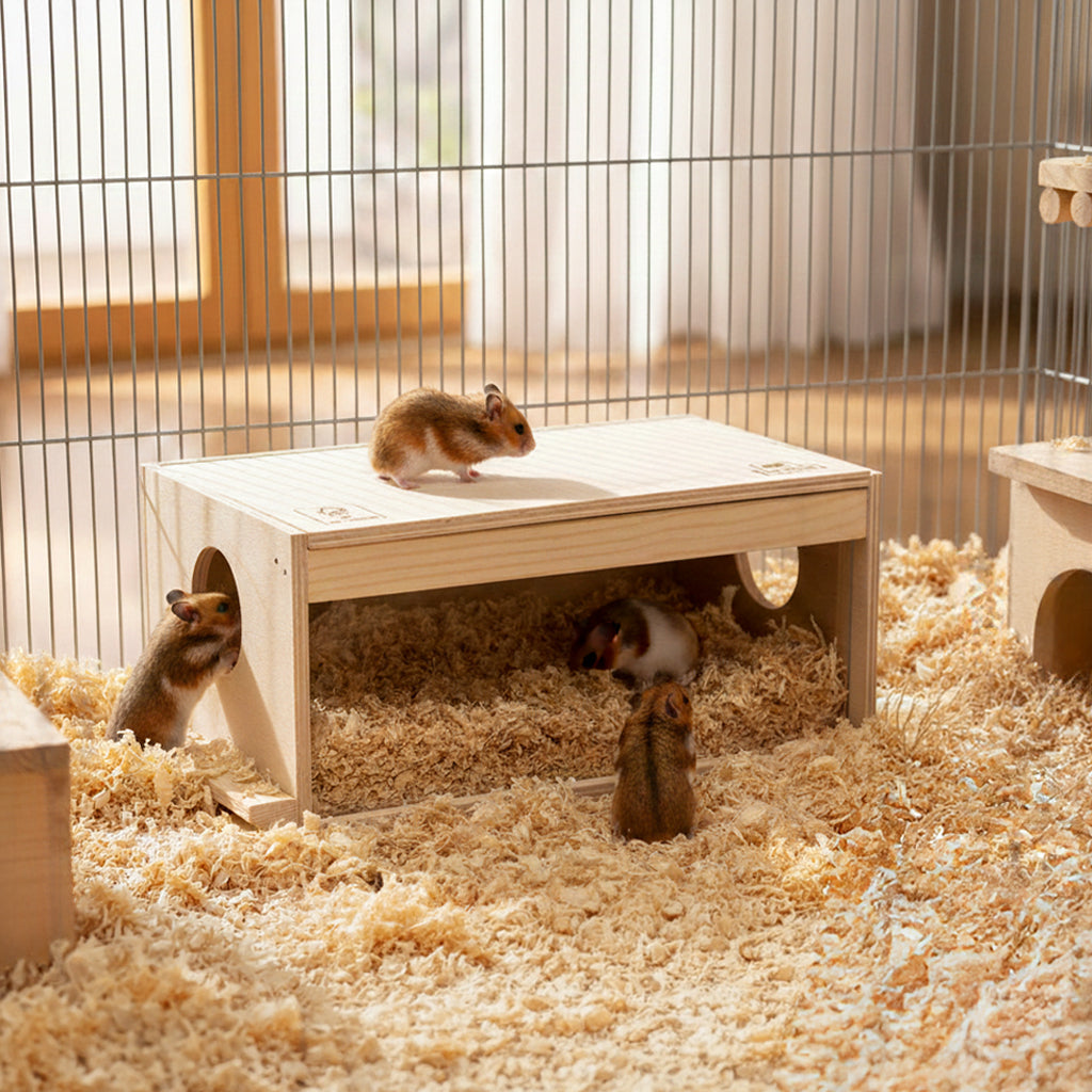Arcade Home est une solide maisonnette en bois pour hamsters et souris équipée d'ouvertures latérales pour un accès facile et d'un dessus qui peut être ouvert pour une inspection ou un entretien rapide. La paroi frontale en plexiglas permet une excellente visibilité de l'animal à l'intérieur. L'accessoire est parfait pour contenir la litière des rongeurs, comme la sciure, les copeaux ou les flocons de bois pressé, indispensables pour absorber les déjections et les mauvaises odeurs. Nous vous recommandons de placer une couche de litière d'au moins 2-3 cm de haut à l'intérieur du conteneur: l'animal aura donc une base confortable, ce qui est essentiel pour l'hygiène et la santé. La couche de litière sert également de cachette, très appréciée de tous les rongeurs, car elle leur permet de creuser, de construire des tunnels et des tanières.