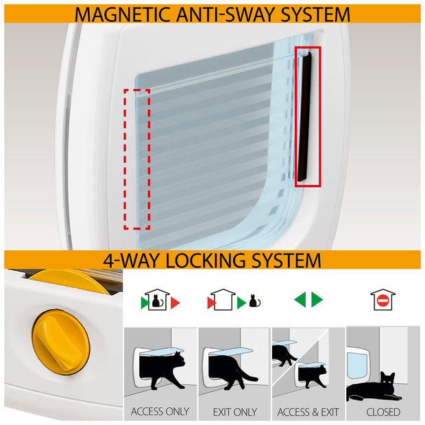 Ces chatières sont équipées de système innovant \wind stopper\, système de protection contre les courants d'air (à l'exception de la Swing 1 et 3 modèles qui ne l'ont pas). Une autre caractéristique importante est le système de fermeture à 4 positionse (non présent dans le modèle de Swing 1) qui vous permet re régler le type d'ouverture selon vos besoins : entrée uniquement, sortie uniquement, entrée et sortie, ou fermé. Enfin, un indicateur de passage (fourni avec Swing 5 et 7) vous aidera à savoir si votre animal est à l'intérieur ou à l'extérieur, il représente une petite languette, placée au bas de la porte qui se placera dans la direction prise par votre petit animal. Les grands modèles disposent d'un tunnel de 5 cm permettant ainsi de s'adapter à toute structure et pouvant être coupé (sauf pour les modèles Swing 7 et Swing microchip qui possèdent un mécanisme délicat). Pour les modèles 1, 3 et 5, livrés tunnels partiels, une extension modulable est disponible en option, elle mesure 5 cm de profondeur (les vis ne sont pas inclues).