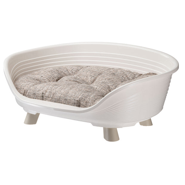 Le fond perforé assure une bonne ventilation, gardant le lit sec et votre animal confortable à tout moment. La corbeille contient un coussin avec un rembourrage en coton à 70 % pour câliner votre animal dans la douceur et la chaleur. Le coussin, qui est lavable, offre une surface reposante en toute saison et, comme il est double face, il s'adapte parfaitement à tous les styles.