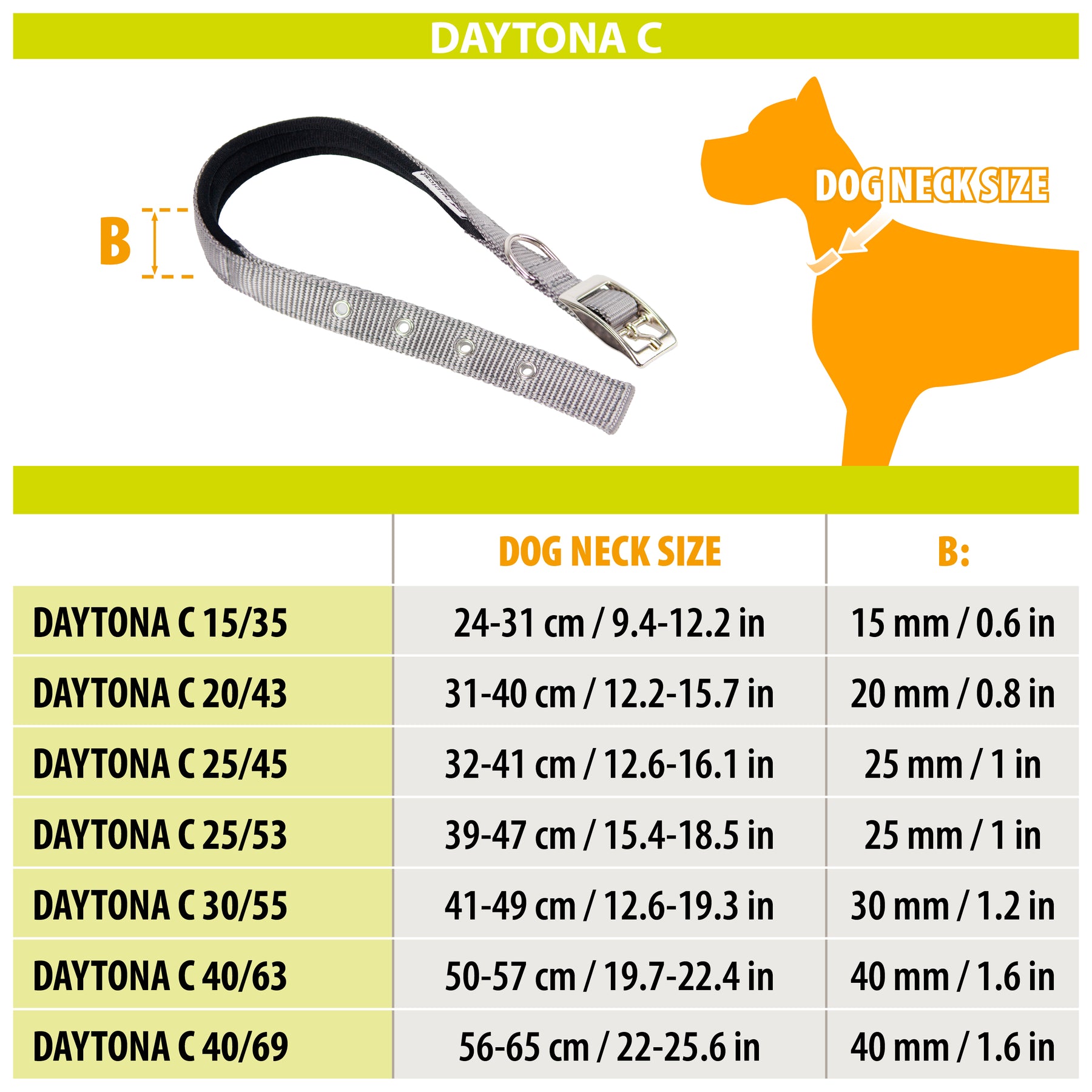 Très confortable sur le cou de votre compagnon à quatre pattes grâce au rembourrage doux qui tapisse l'intérieur, Daytona C est un collier pour chien en nylon, une matière qui le rend particulièrement résistant au stress de l'animal. Réglable grâce aux quatre trous, il possède une solide boucle en métal chromé qui assure une fermeture efficace et sûre. Pour s'adapter à toutes les tailles de chiens, Daytona C est disponible en différentes tailles, avec une circonférence allant d'un minimum de 27 à un maximum de 69 cm et une largeur de la sangle allant de 15 à 40 mm. Ce collier peut être choisi dans une large gamme de couleurs.