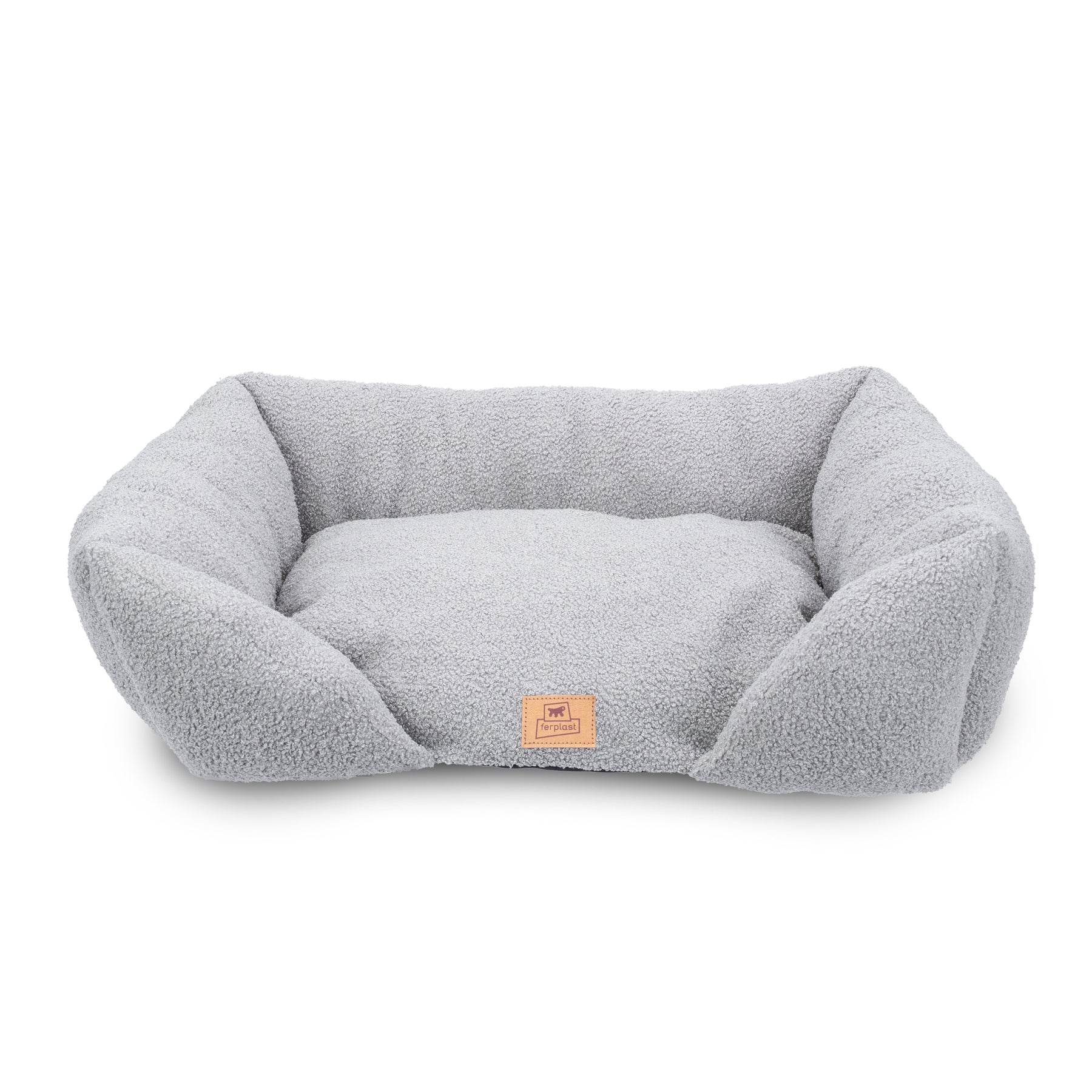 Canapé rembourré pour chiens et chats en doux tissu bouclé, avec entrée abaissée et rebords élevés pour confort et praticité
