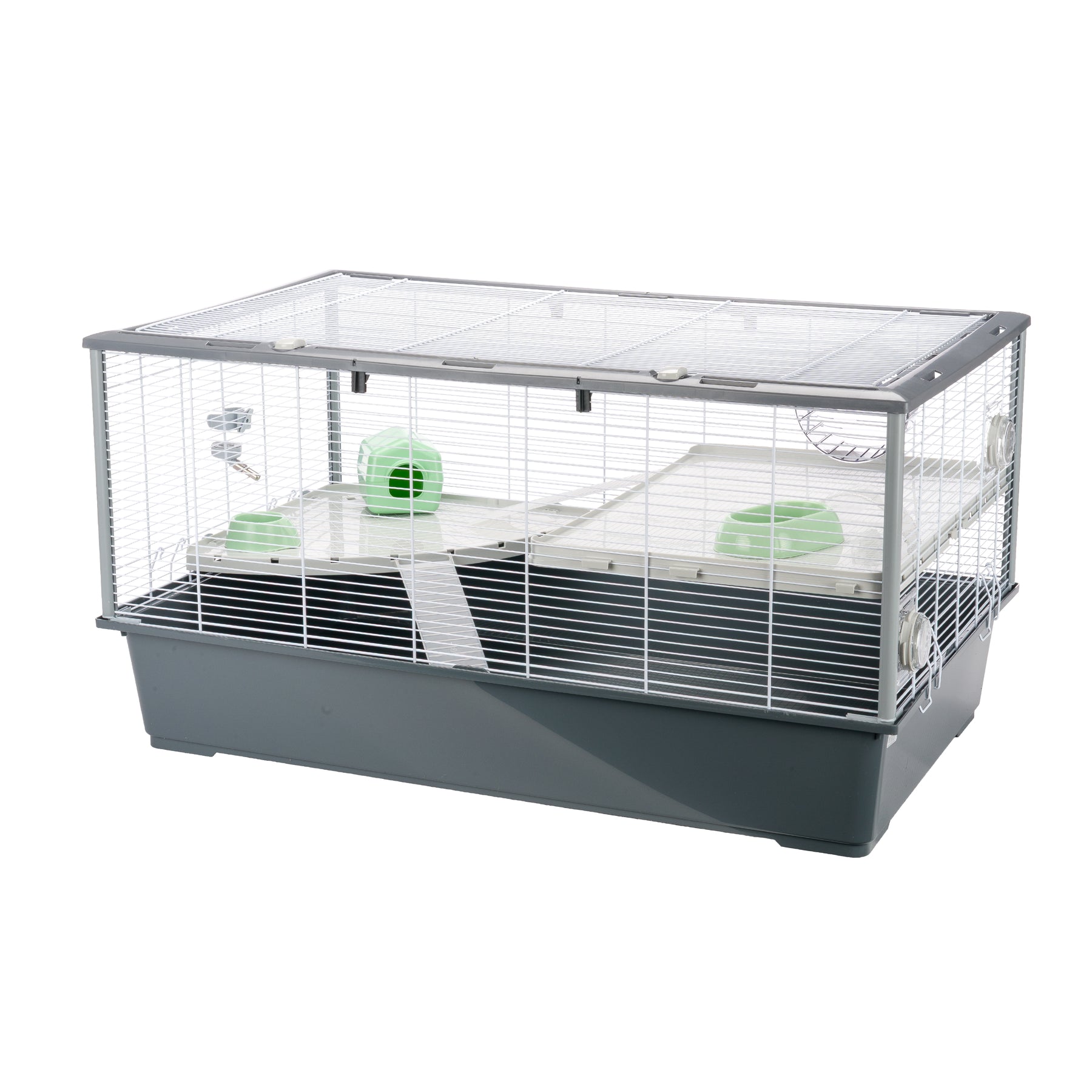Criceti 100 est une cage hamsters fabriquée avec des matériaux de haute qualité: le grillage est en métal laqué, le cadre et les montants en plastique aportent une solidité maximale et une longue durabilité. La grille sur le dessus que vous pourrez ouvrir facilement facilitera les opérations d'entretien. Sans danger pour l'animal, la grille est facilement verrouillable grâce aux crochets. Le bac de cage peut être détaché de la cage pour un nettoyage facile. Cette cage est également prédisposée pour recevoir des tunnels et autres accessoires pour rongeurs.