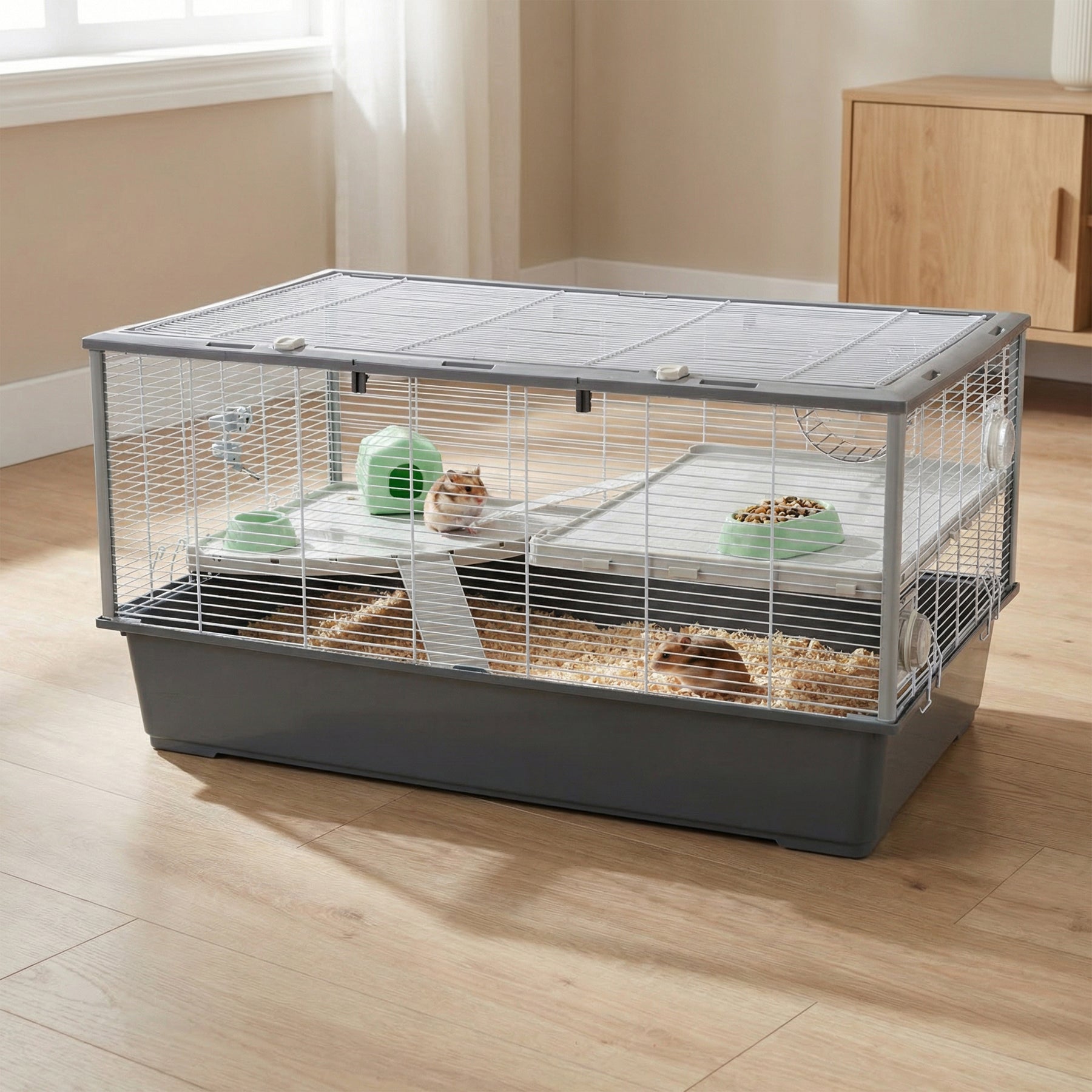 Conformément aux normes européennes plus restrictives concernant les dimensions des cages, Criceti 100 assure un large espace et un maximum de confort pour votre animal de compagnie. L'habitat est divisé en trois étage avec échelles et étagères créant différentes zones conçues pour chaque moment de la journée. Grâce à un bac grande capacité, la litière ne sortira pas inutilement du bac permettant ainsi à votre rongeur de se cacher, s'amuser et creuser. Dans les étages supérieurs, votre animal de compagnie pourra manger, boire, jouer ou se reposer grâce aux accessoires essentiels inclus : écuelle, abreuvoir, roue et nid. Ces accessoires pourront être positionnés comme vous le souhaitez.