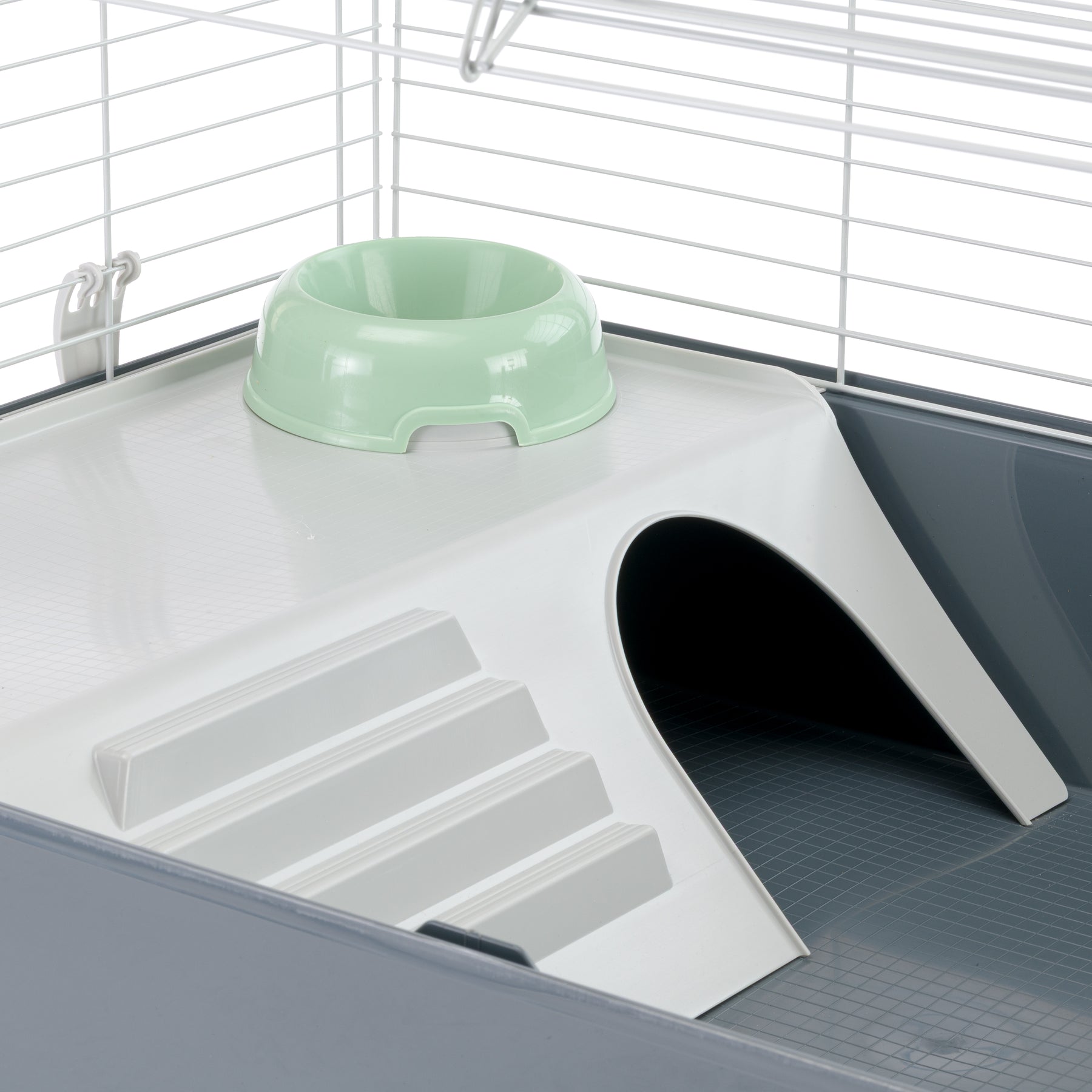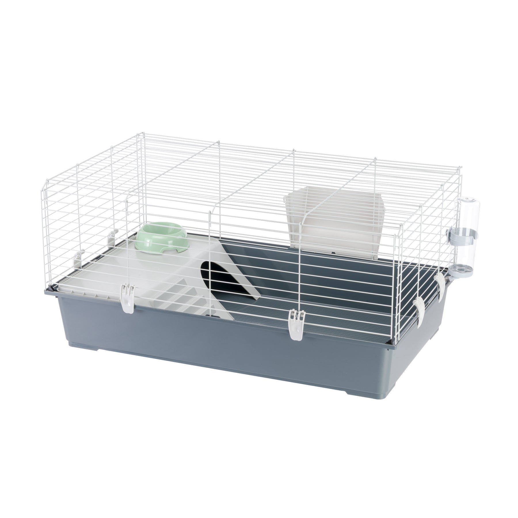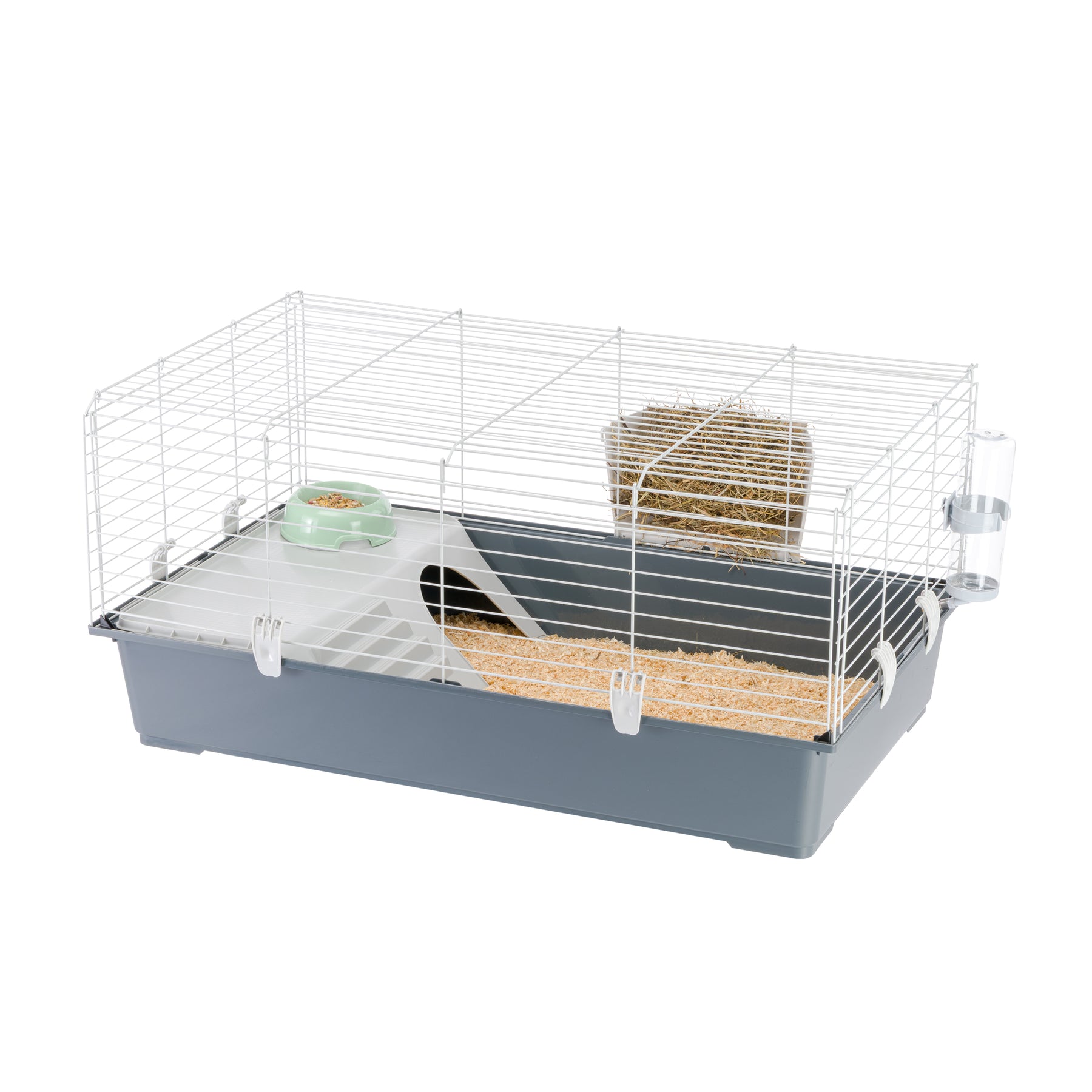 Cette cage possède un intérieur spacieux et elle est équipée de tous les accessoires nécessaires pour votre animal de compagnie : le ratelier à foin, l'abreuvoir, la mangeoire et la maisonnette pour des moments de repos.