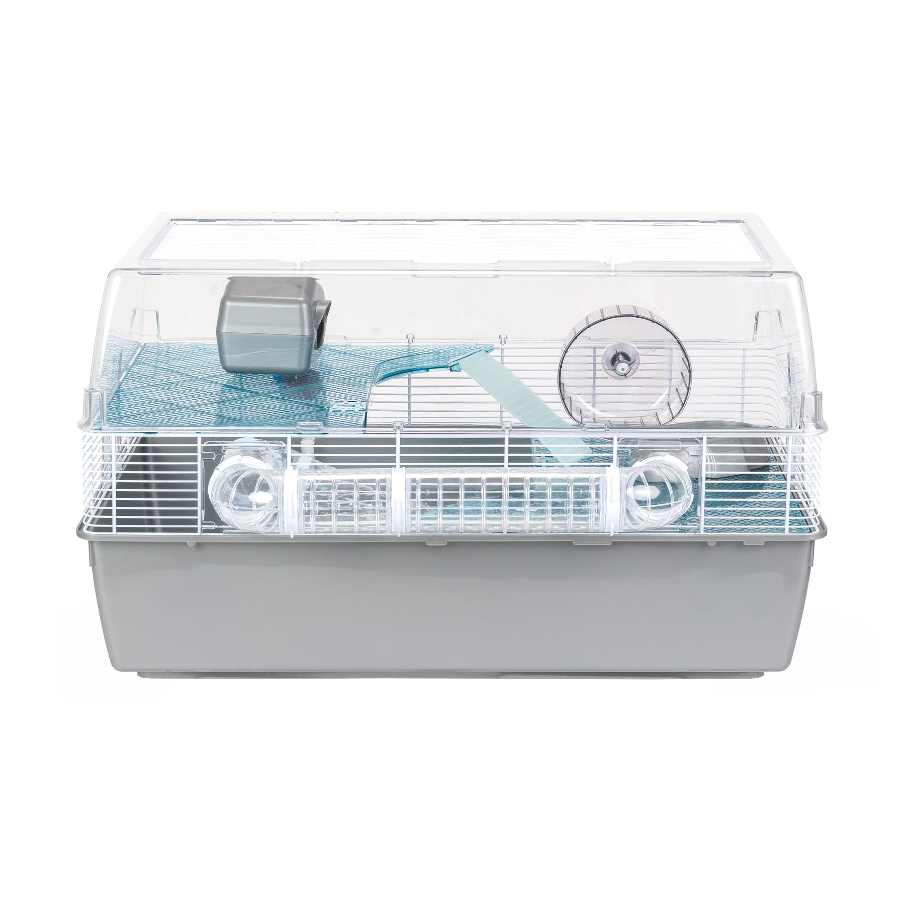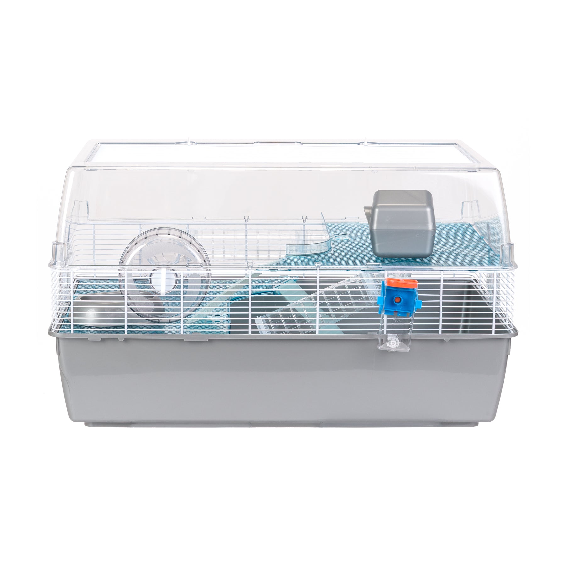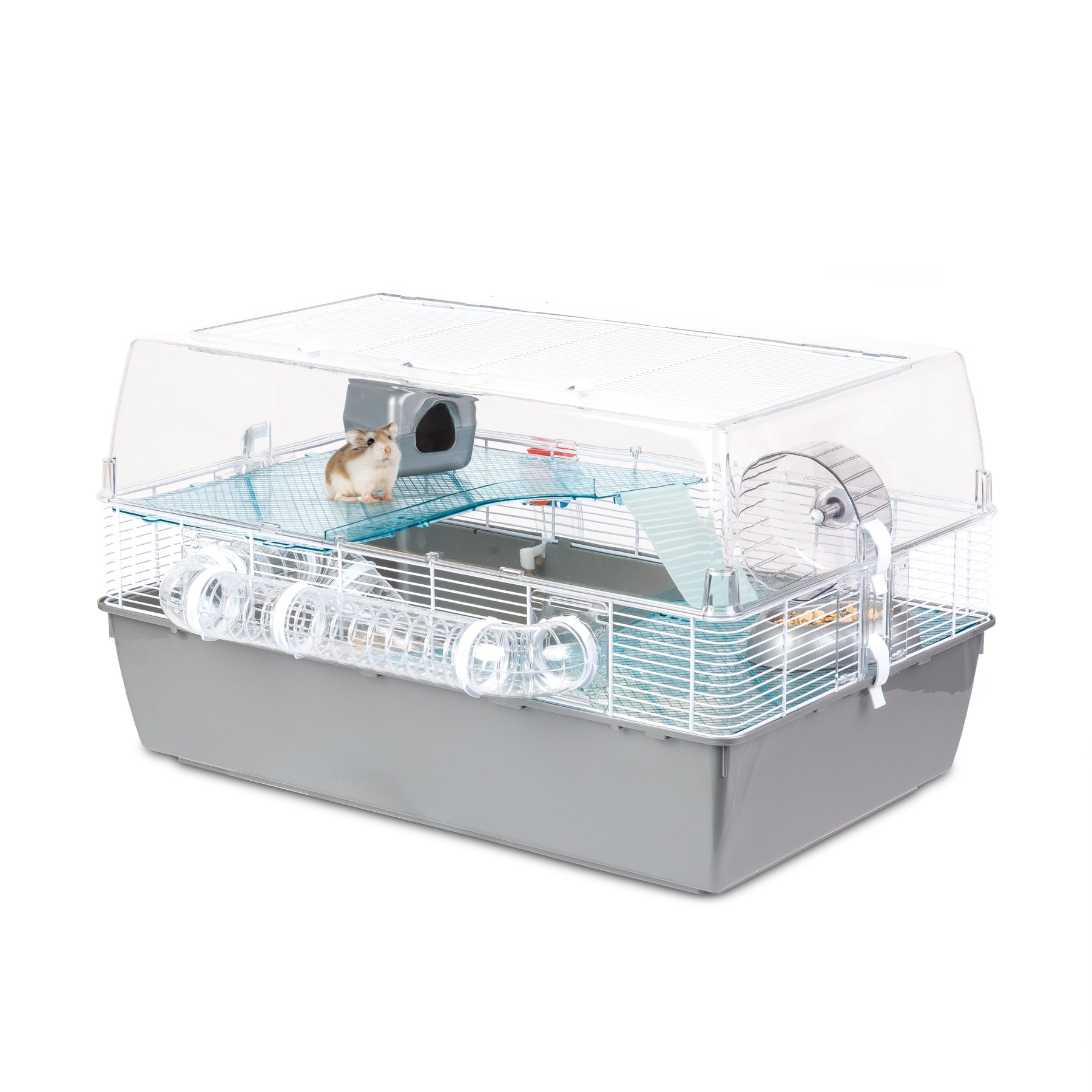 Duna Fun Large est une cage pour hamsters spacieuse comprenant trois niveaux et livrée avec les accessoires suivants : une mangeoire, une échelle, un abreuvoir, une roue et des tunnels transparents indispensables pour veiller à ce que votre petit compagnon s'amuse.