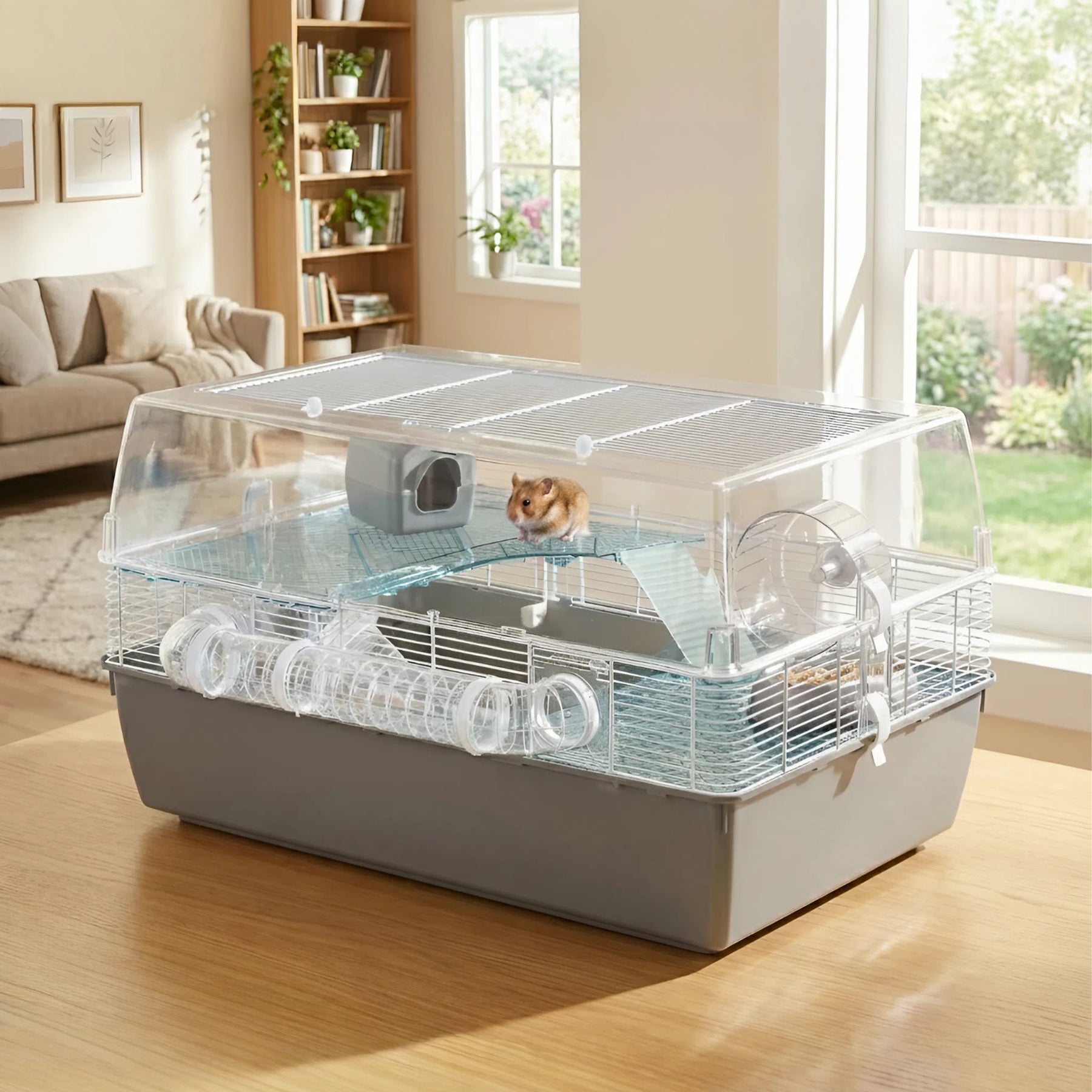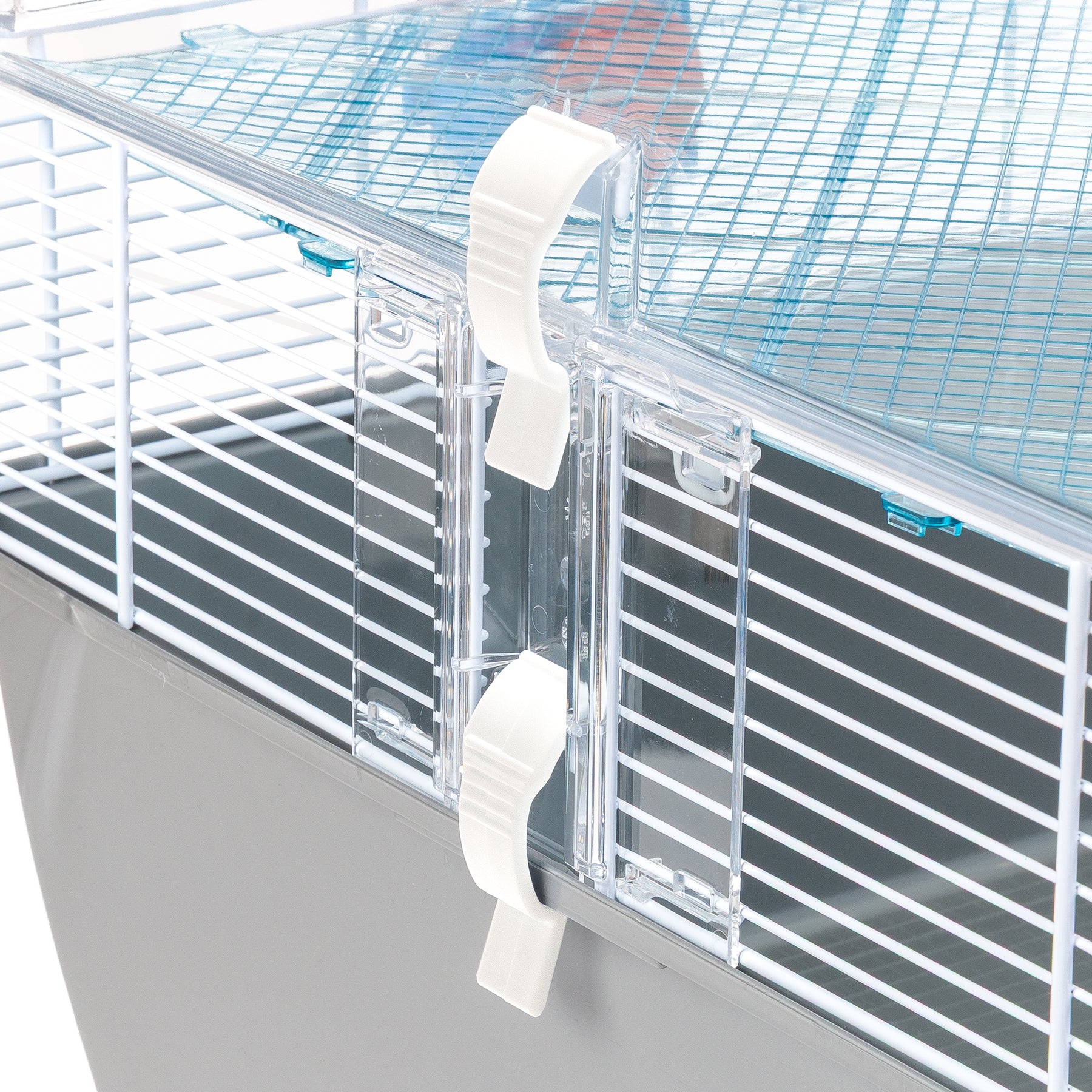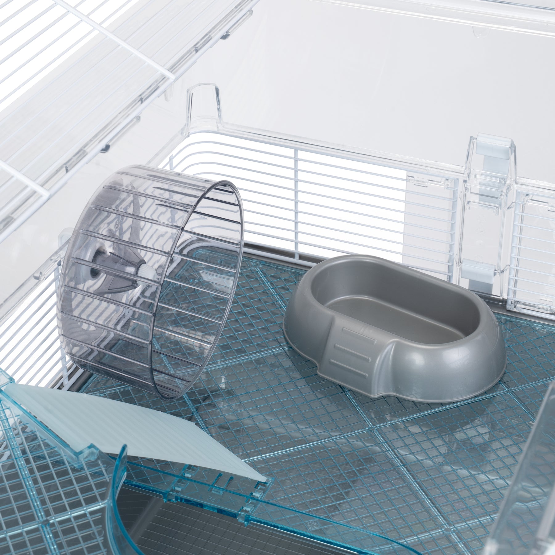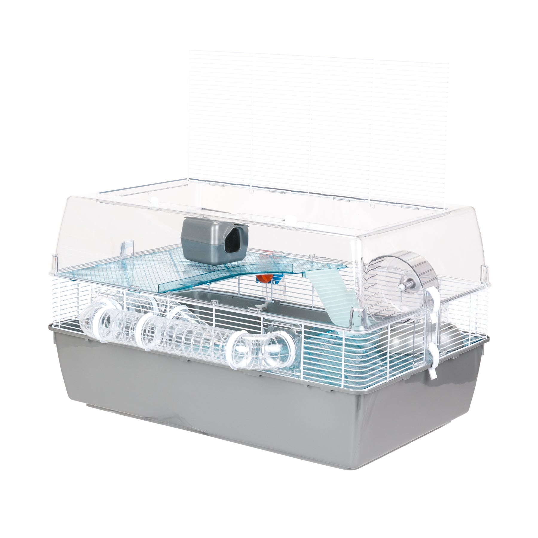 Duna Fun Large est une cage pour hamsters spacieuse comprenant trois niveaux et livrée avec les accessoires suivants : une mangeoire, une échelle, un abreuvoir, une roue et des tunnels transparents indispensables pour veiller à ce que votre petit compagnon s'amuse.