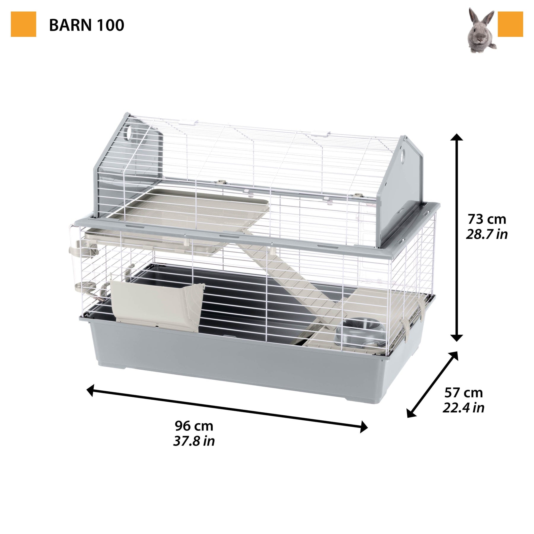 Barn 100 rappelle une grange américaine grâce à sa forme et son toit surélevé! Confortable et spacieuse, cette cage à lapins dispose d'une grande surface de vie : à l'étage inférieur, vous trouverez une maisonette, parfaite pour des moments de détente, tandis qu'une échelle en plastique mène à l'étage supérieur, où vous trouverez l'espace de vie pour vos animaux de compagnie. L'habitat est équipé d'accessoires indispensables tels que mangeoire, écuelle et abreuvoir.