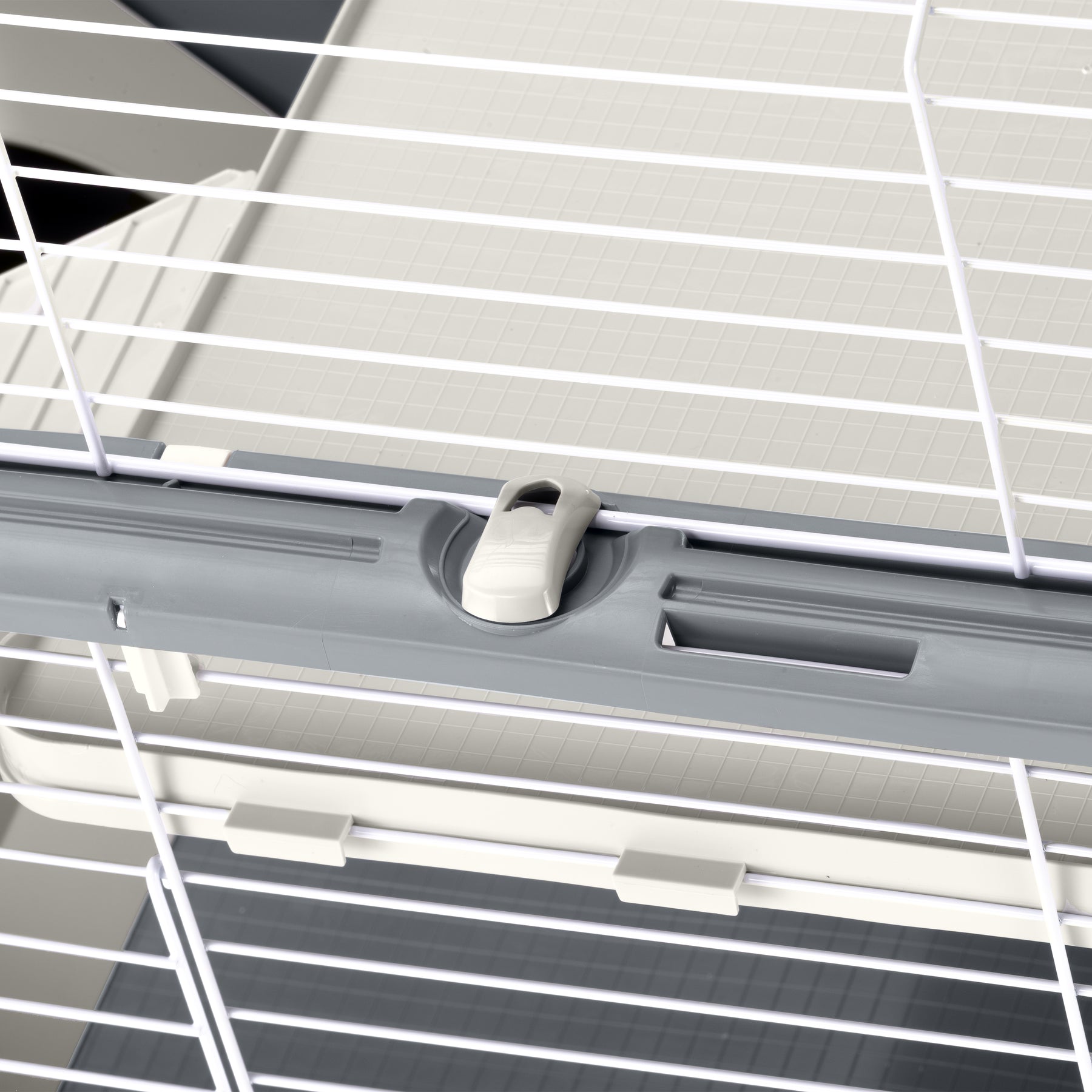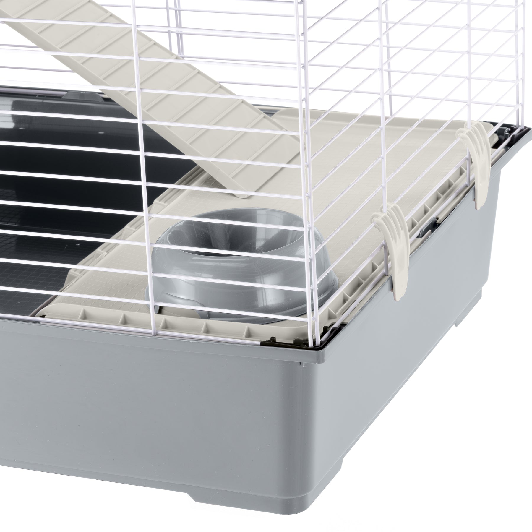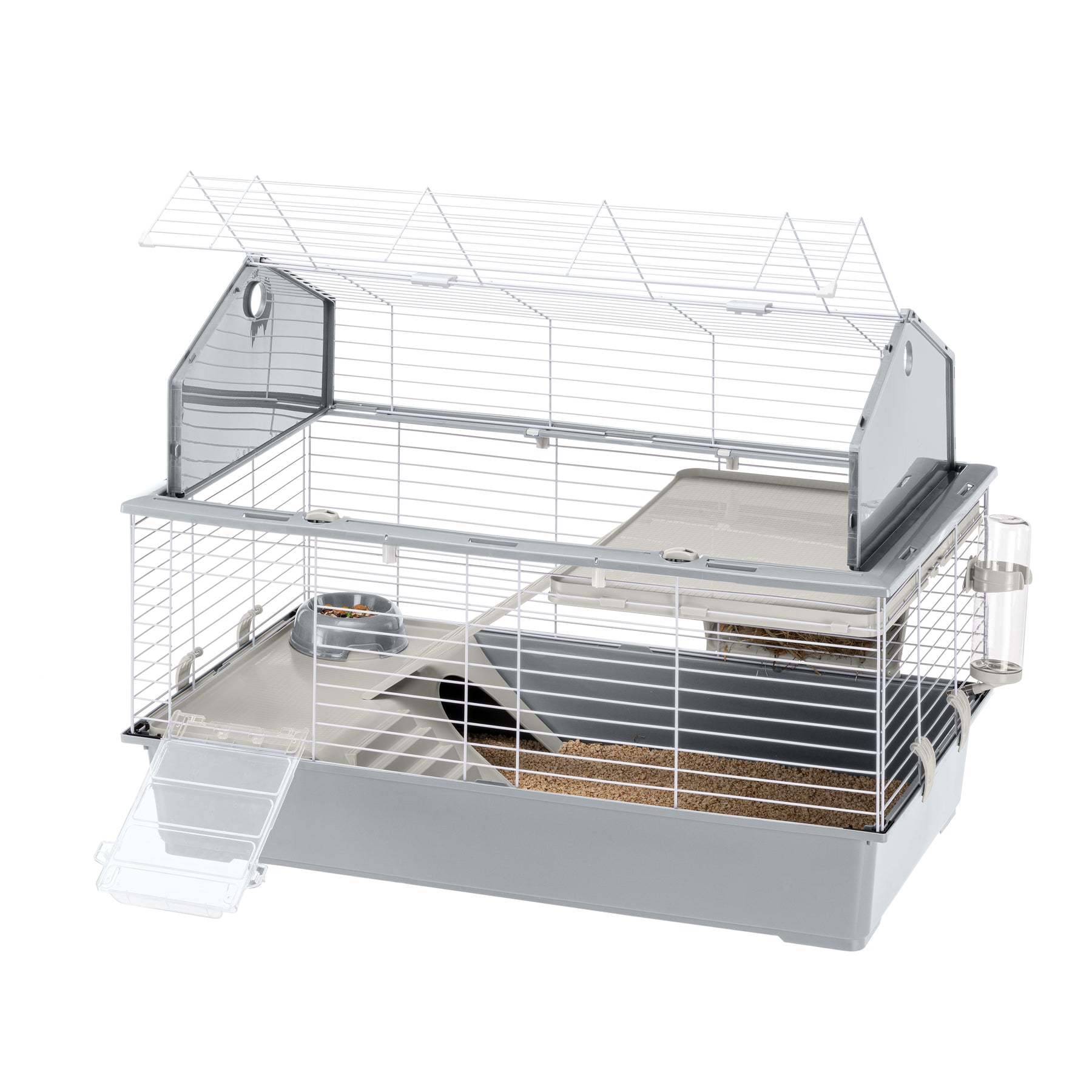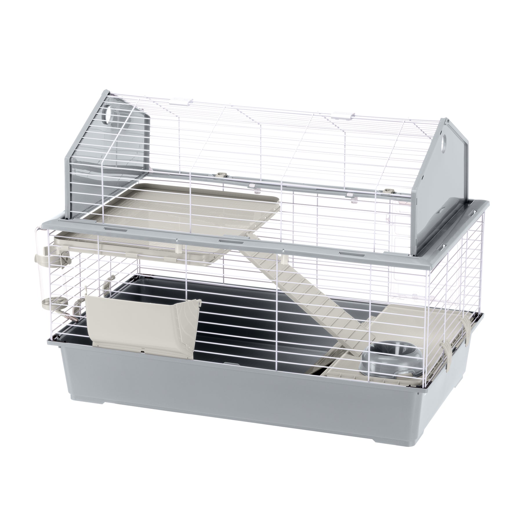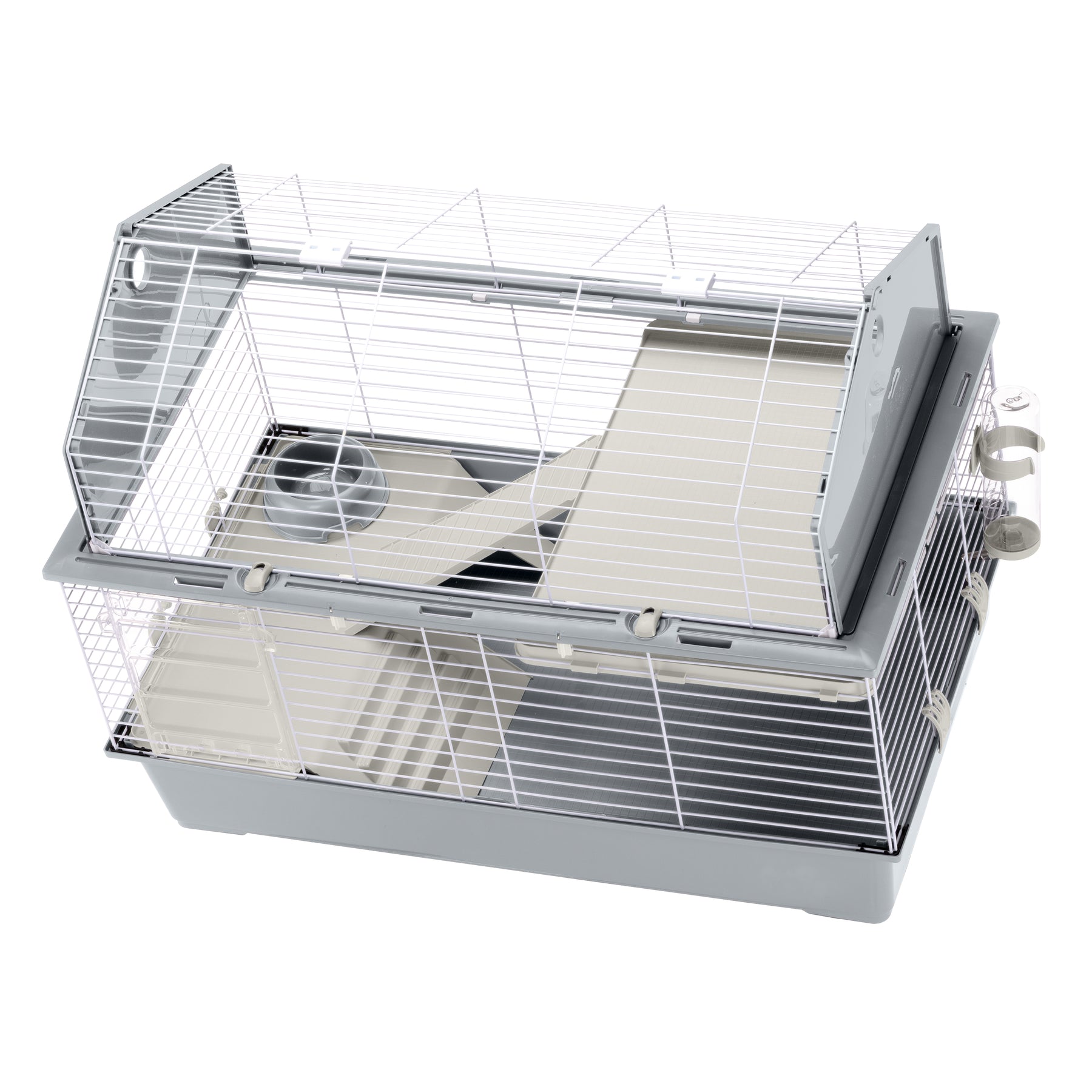 La cage, qui peut être complètement démontée, pour maintenir un volume réduit est fabriquée d'un grillage métallique robuste peint avec une base en résine thermoplastique pour contenir efficacement saleté, litière et résidus alimentaires. Sur le devant, une échelle confortable permet à votre petit animal de compagnie de sortir et d'entrer en toute autonomie.