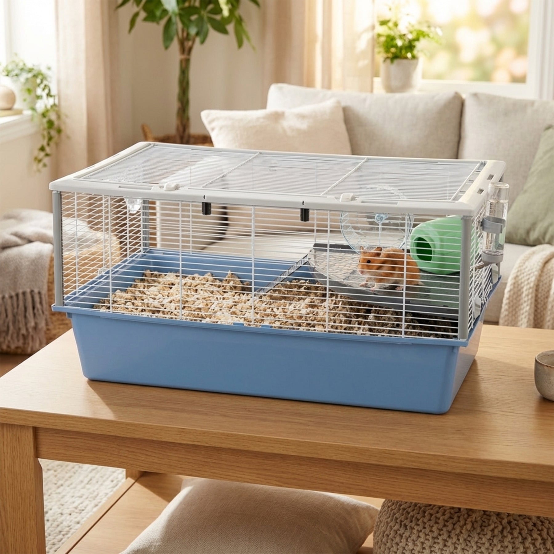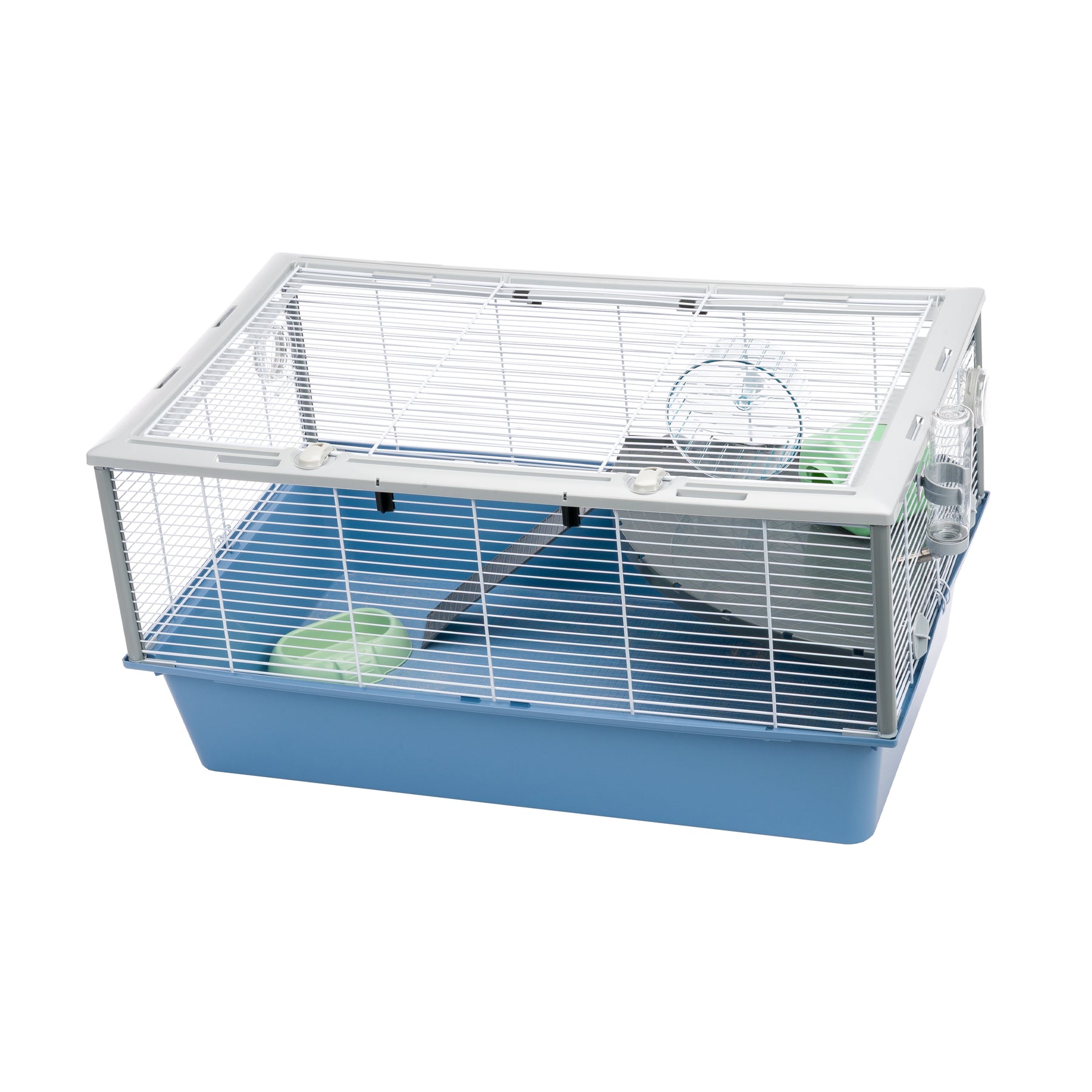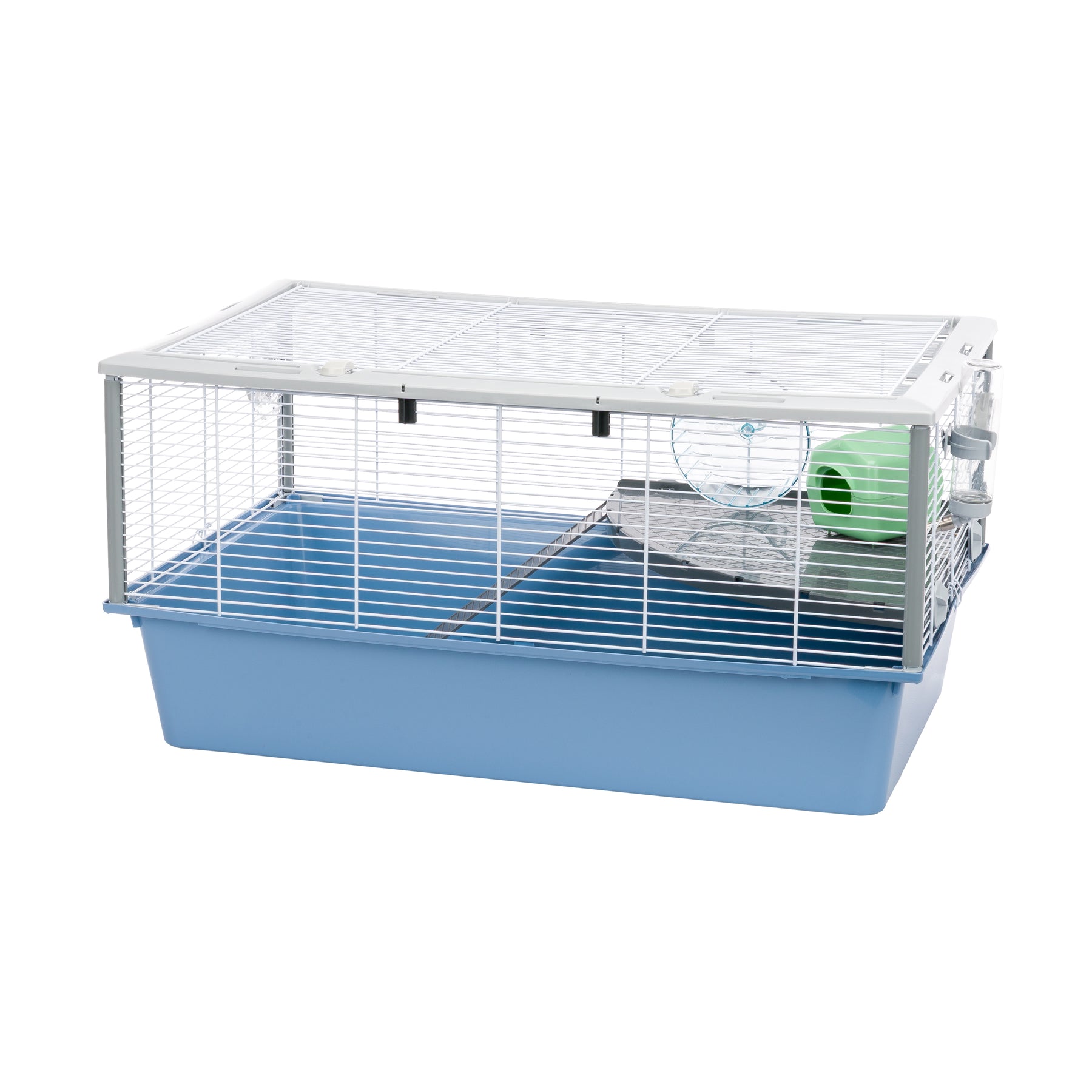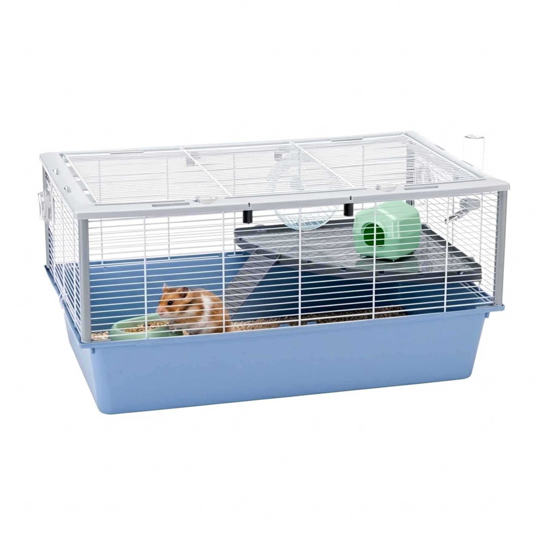 Criceti 80 est une grande cage pour hamsters dotée d’une base en plastique profonde, conçue pour empêcher la litière de sortir de la cage.