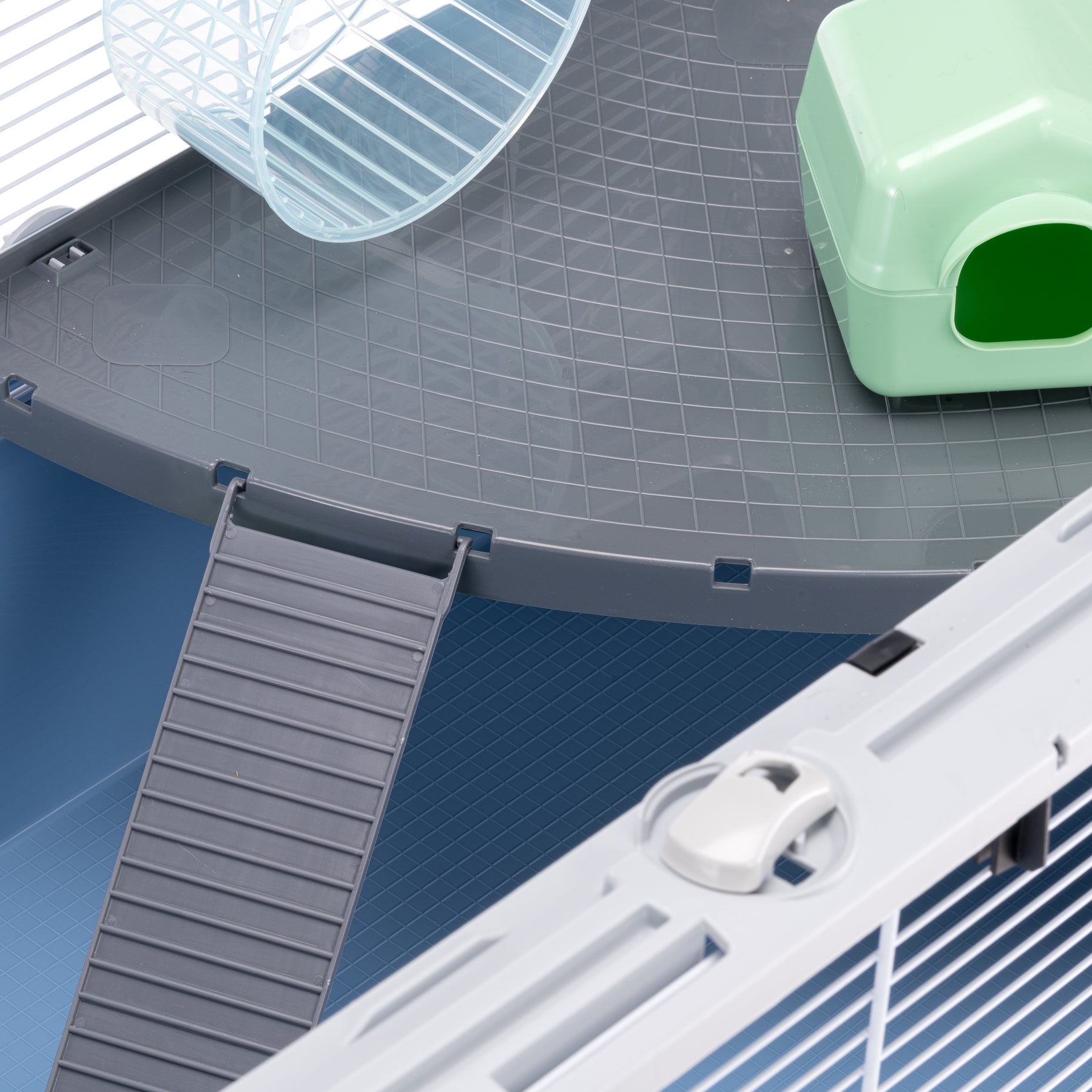 Une large plateforme avec échelle divise la cage en deux niveaux, pensés pour les différentes activités du petit rongeur : le niveau inférieur, plus calme, est idéal pour le repos, tandis que le niveau supérieur convient parfaitement pour manger, boire et jouer.