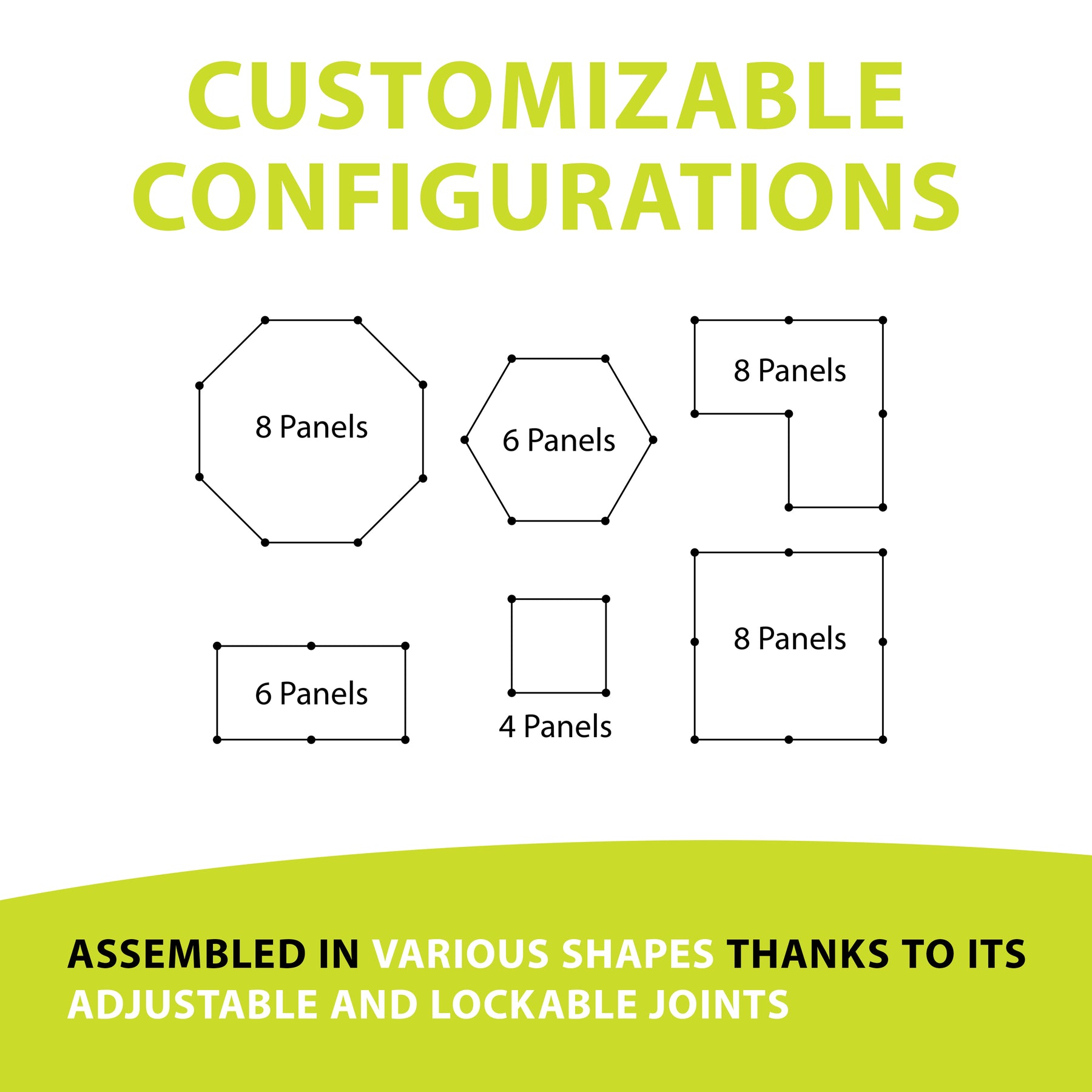 Grâce à ses joints réglables et verrouillables, DOG FENCE peut être configuré sous différentes formes : carré, rectangle, polygone ou mise en forme entièrement personnalisée, selon l’espace disponible. Les pieds antidérapants assurent une excellente stabilité sur divers sols, tandis que la porte équipée d’un verrou de sécurité permet un accès pratique et totalement contrôlé. L’installation ne nécessite aucun outil et peut être réalisée en quelques minutes, ce qui en fait une solution flexible pour un usage permanent ou occasionnel.