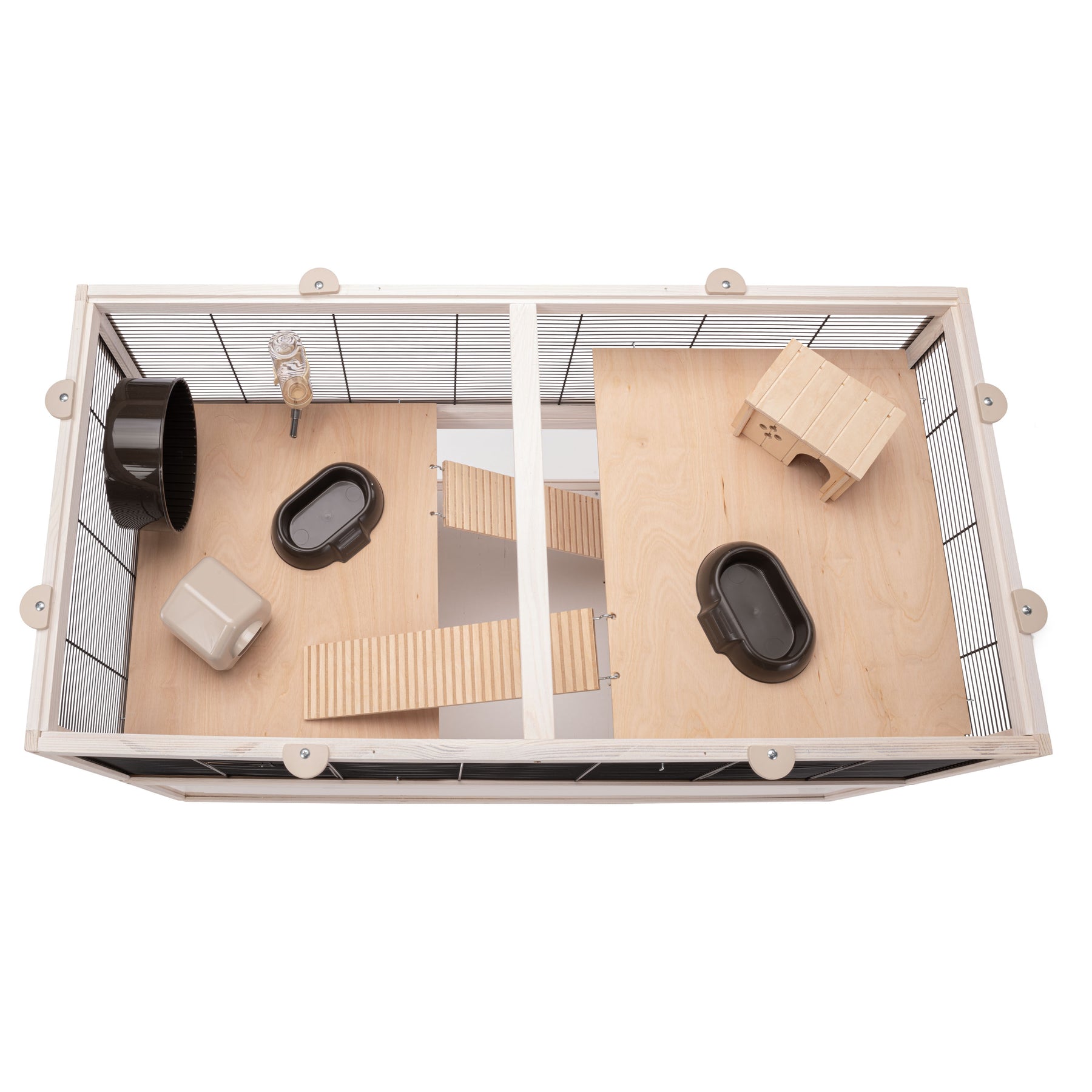 A l'intérieur, chaque habitat Domster est équipé d'accessoires pour offrir à votre rongeur tout le confort dont il a besoin : ce modèle comprend une maison en bois et une maison en plastique pour se reposer, deux bols de nourriture, une roue pour se maintenir en forme et un abreuvoir avec un bec en acier inoxydable