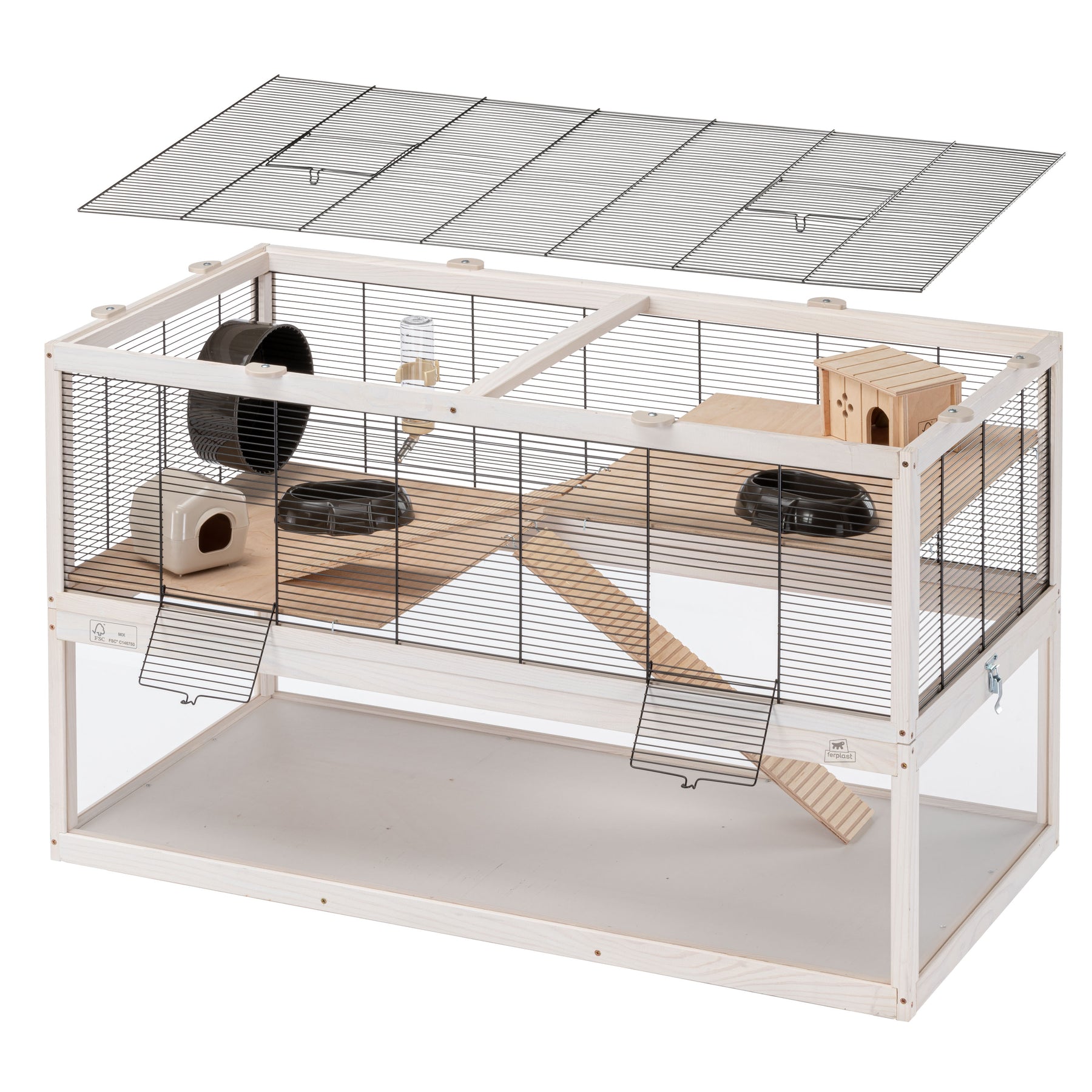 - Cage en bois avec accessoires inclus: 1 maison en bois et 1 maison en plastique pour hamsters et souris, 1 abreuvoir, 2 mangeoires et 1 roue pour l'exercice