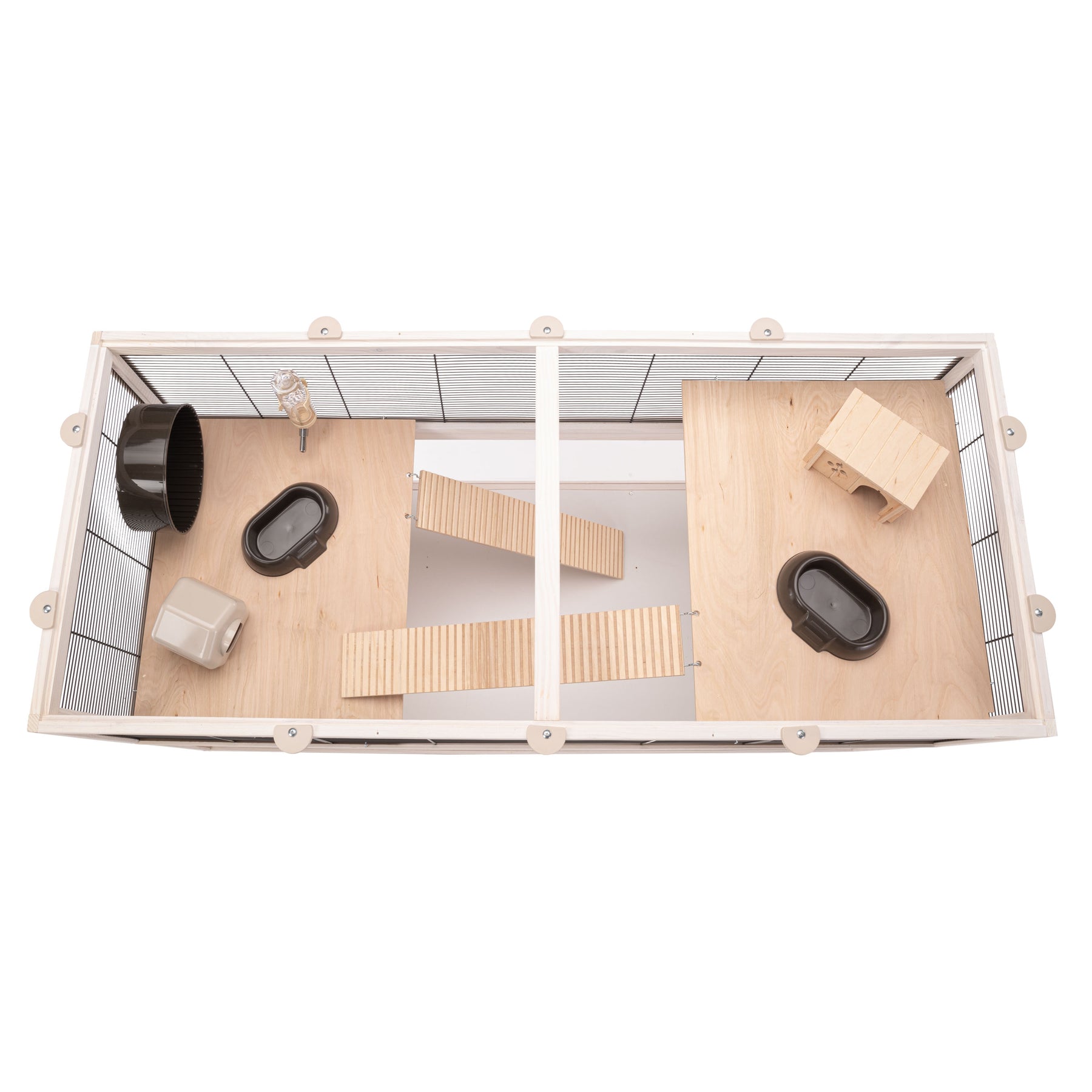 À l'intérieur, chaque habitat Domster est équipé d'accessoires pour offrir à votre rongeur tout le confort dont il a besoin : ce modèle comprend une maison en bois et une maison en plastique pour se reposer, deux gamelles, une roue pour se maintenir en forme et un abreuvoir avec un bec en acier inoxydable.