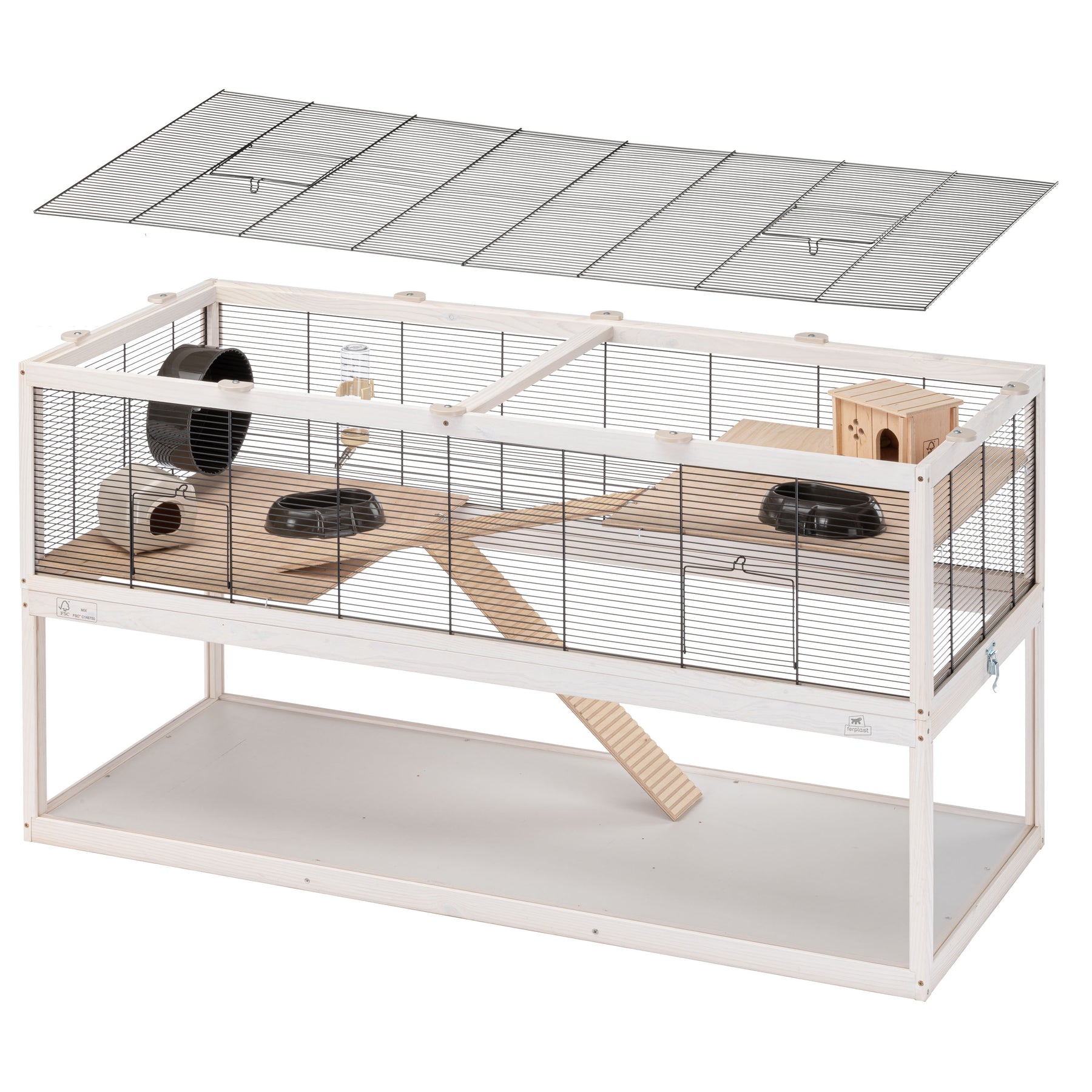 - Cage en bois avec accessoires inclus: 1 maison en bois et 1 maison en plastique pour hamsters et souris, 1 abreuvoir, 2 mangeoires et 1 roue pour l'exercice