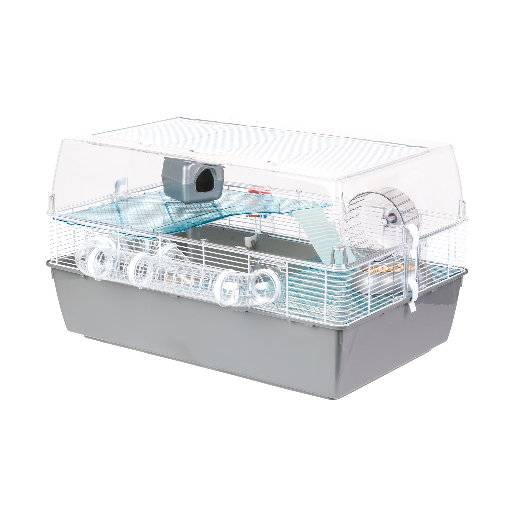 Duna Fun Large est une cage pour hamsters spacieuse comprenant trois niveaux et livrée avec les accessoires suivants : une mangeoire, une échelle, un abreuvoir, une roue et des tunnels transparents indispensables pour veiller à ce que votre petit compagnon s'amuse.