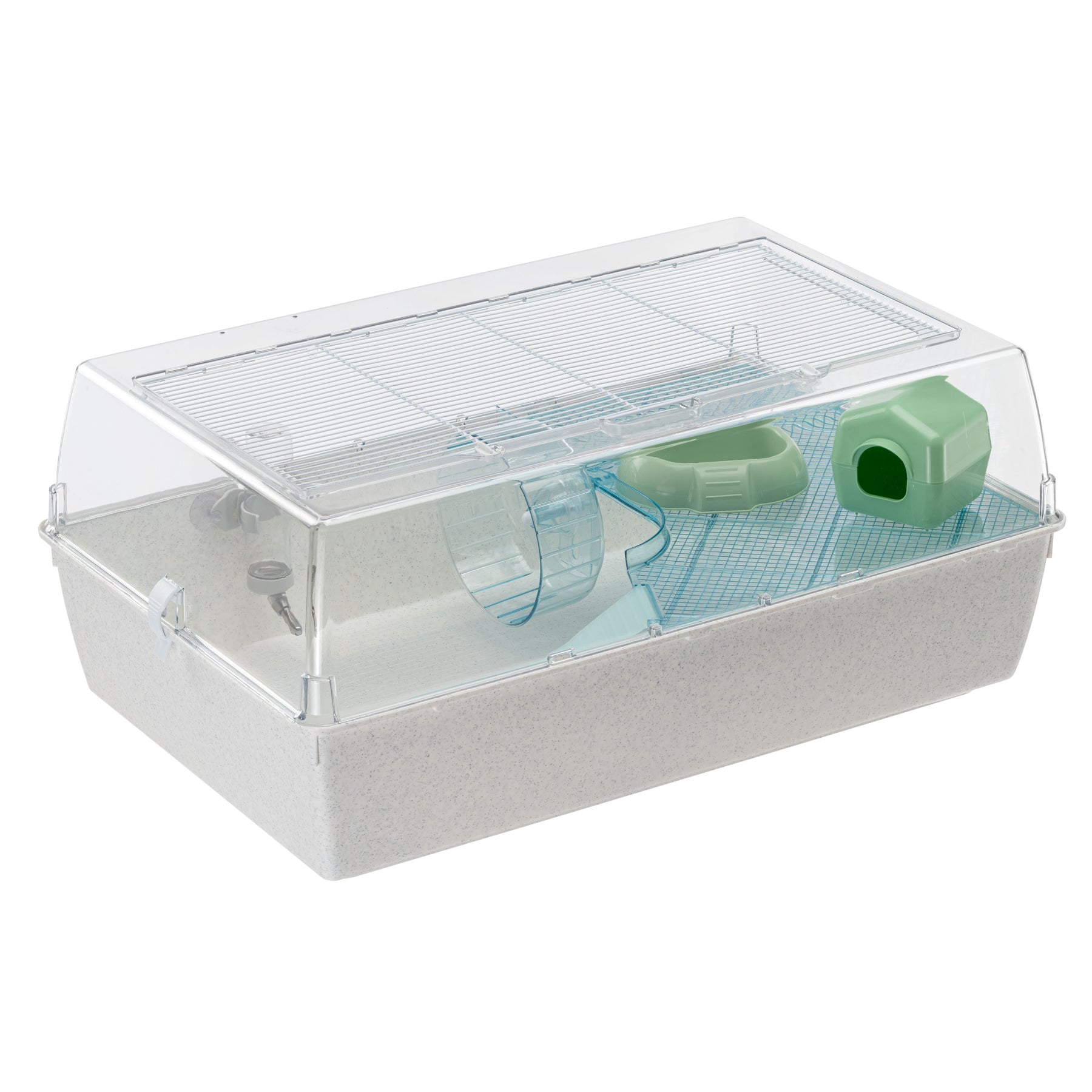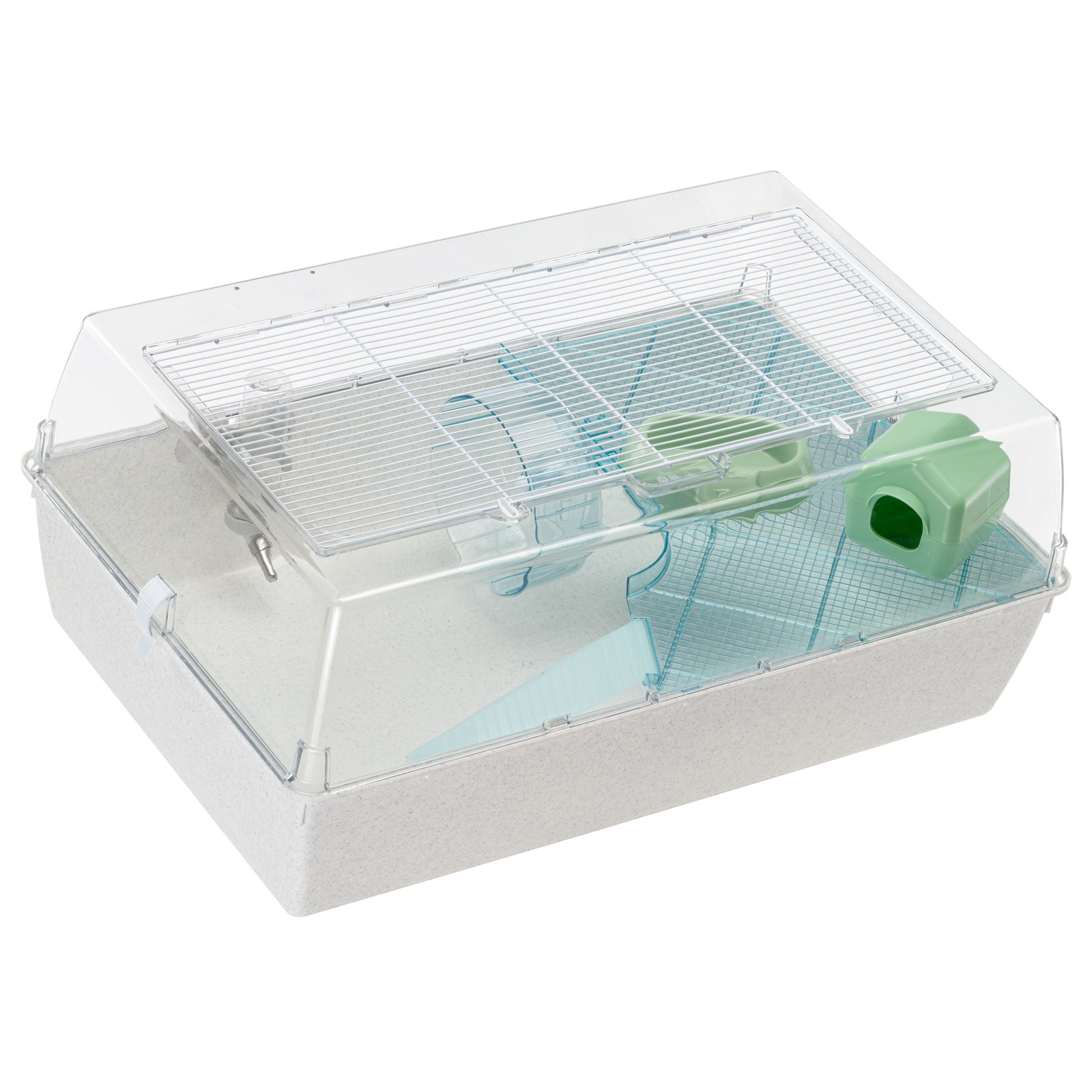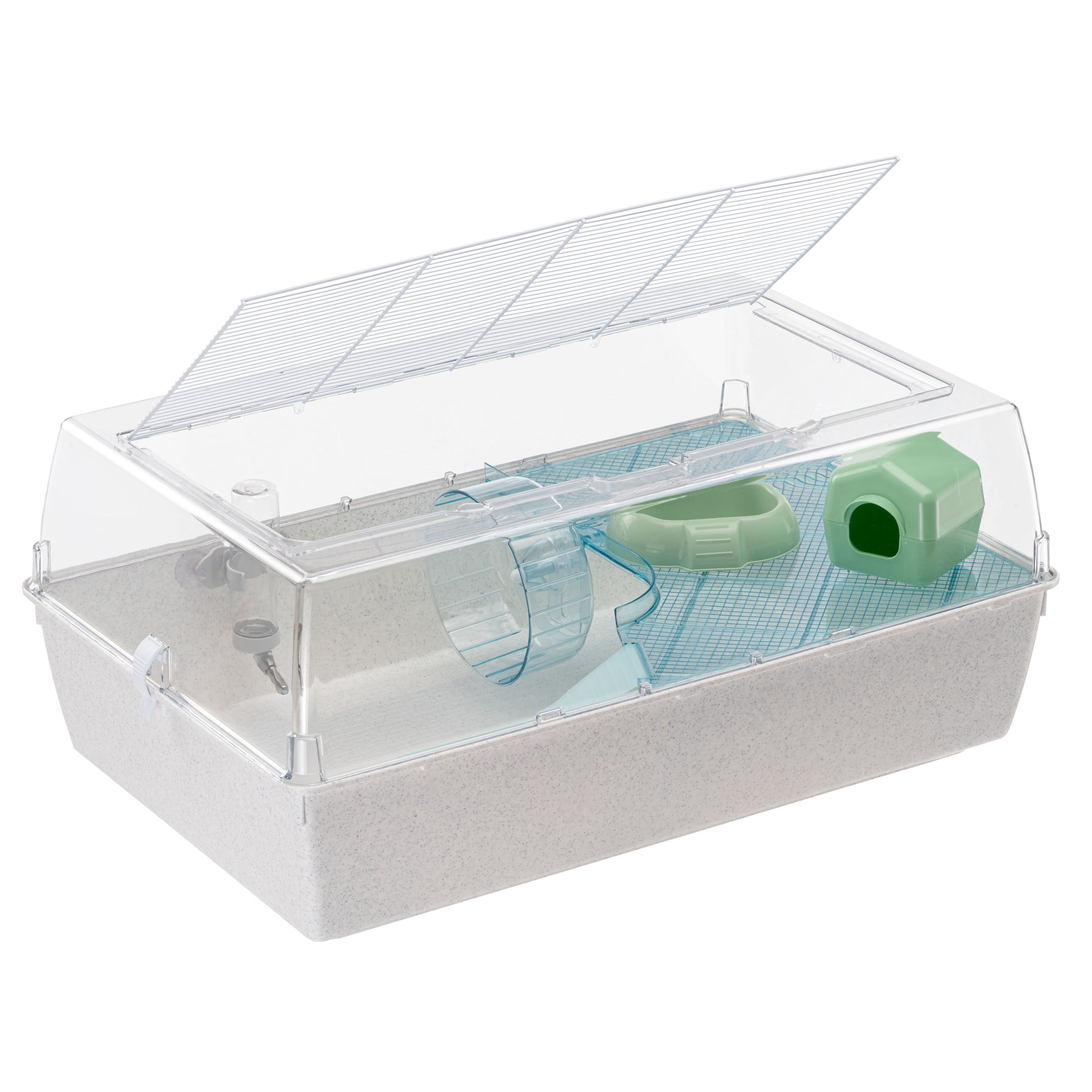 Le couvercle en plastique transparent est doté d'un toit avec une grille métallique peinte, qui assure une ventilation optimale tout en permettant une vue claire de l'intérieur. Cette grille peut être facilement soulevée et verrouillée à l'aide de crochets rotatifs, ce qui permet d'accéder facilement et en toute sécurité à l'intérieur de la cage.