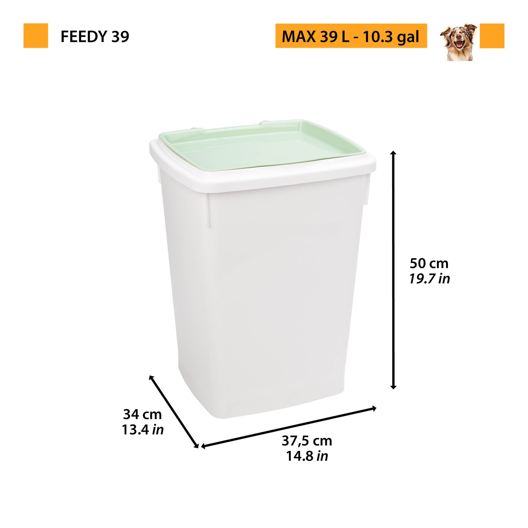 Il est disponible en trois tailles différentes : Feedy 13, 26 et 39, qui contient respectivement, 5, 10 et 15 kg de nourriture pour chiens. Avec Feedy, vous pouvezstocker la nourriture pendant de longues périodes.