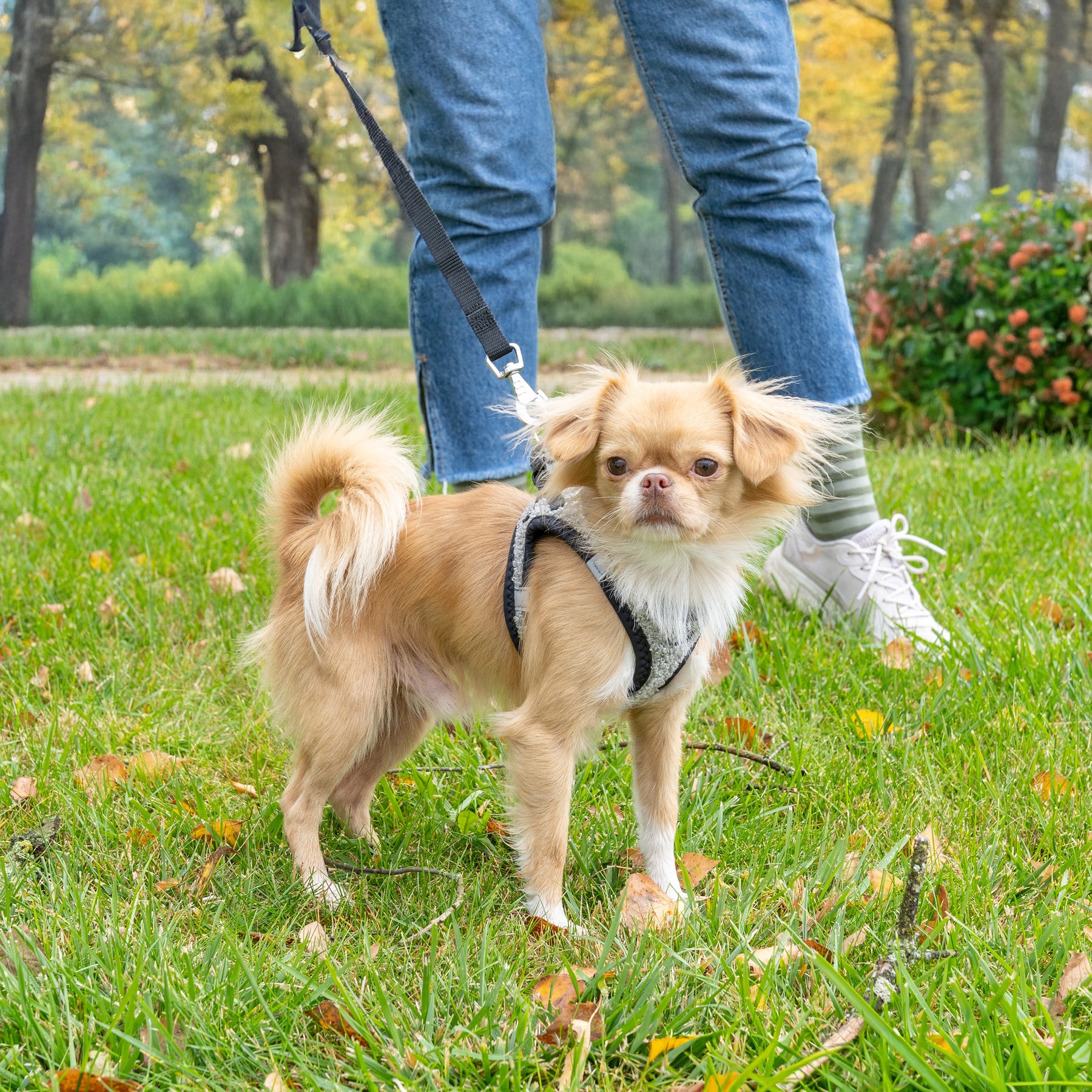 Facile à enfiler et à ajuster, il dispose de boucles coulissantes pour un ajustement personnalisé et d’un clip de fermeture à clic sécurisé et pratique. Les doubles anneaux métalliques permettent une fixation solide et fiable de la laisse.