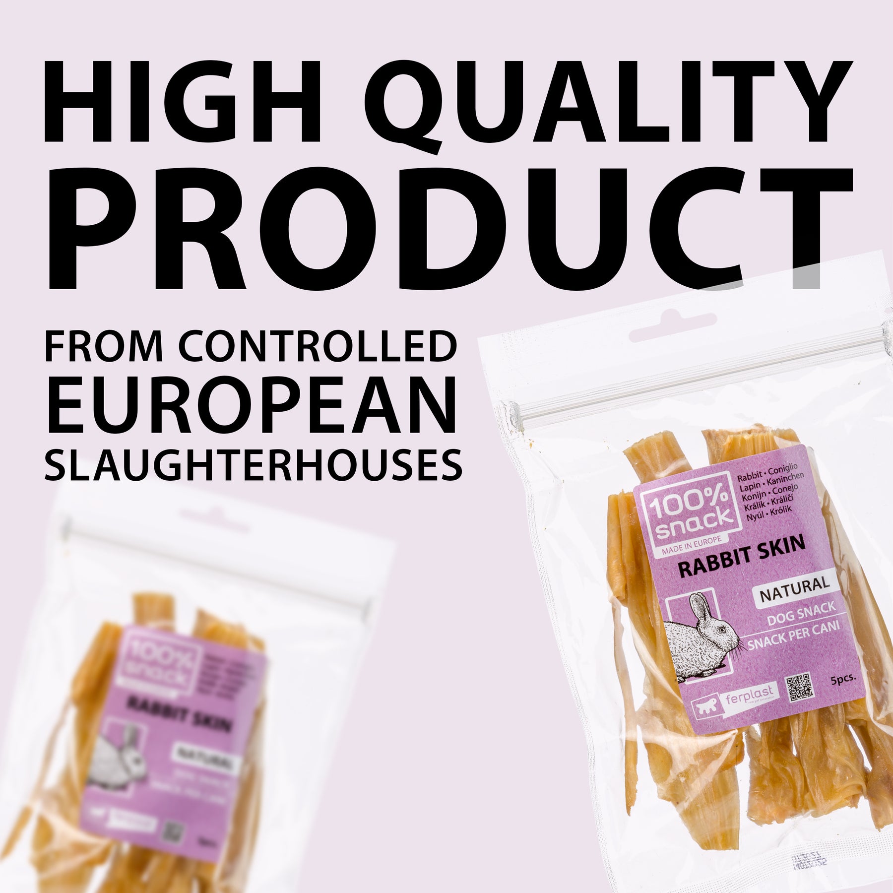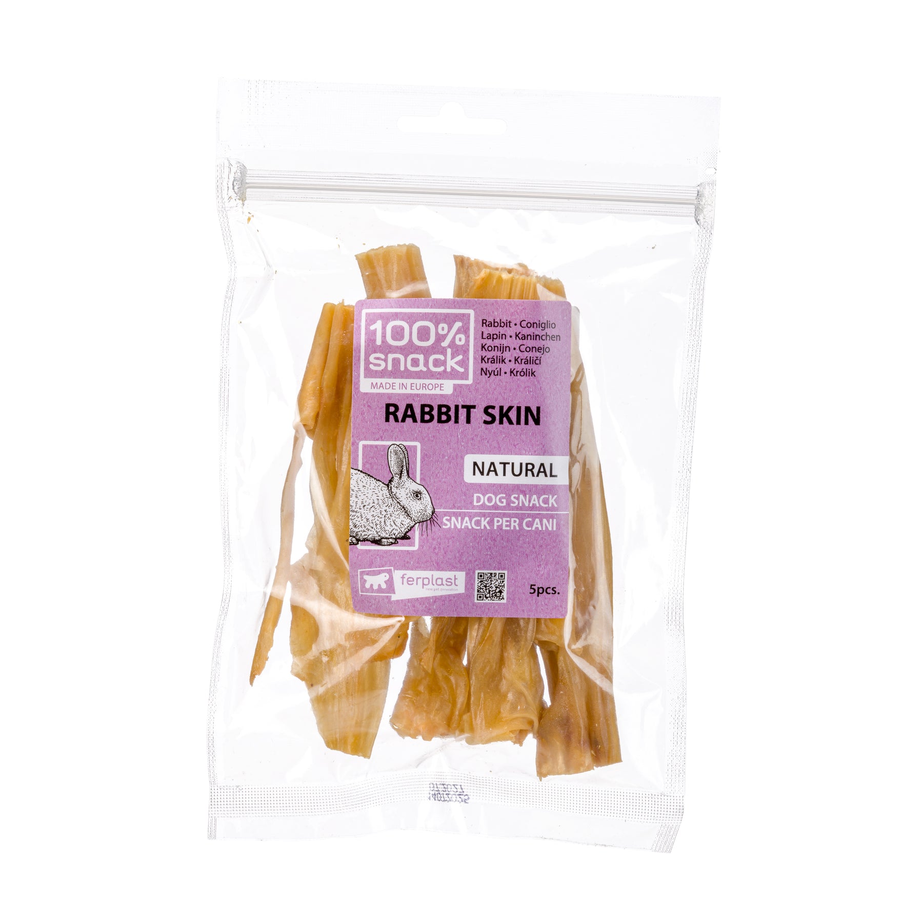 Produit en Europe selon des standards de qualité élevés, la peau de lapin séchée au four convient aux chiens de toutes tailles. Il est recommandé de la donner sous surveillance et de laisser de l’eau fraîche à disposition.