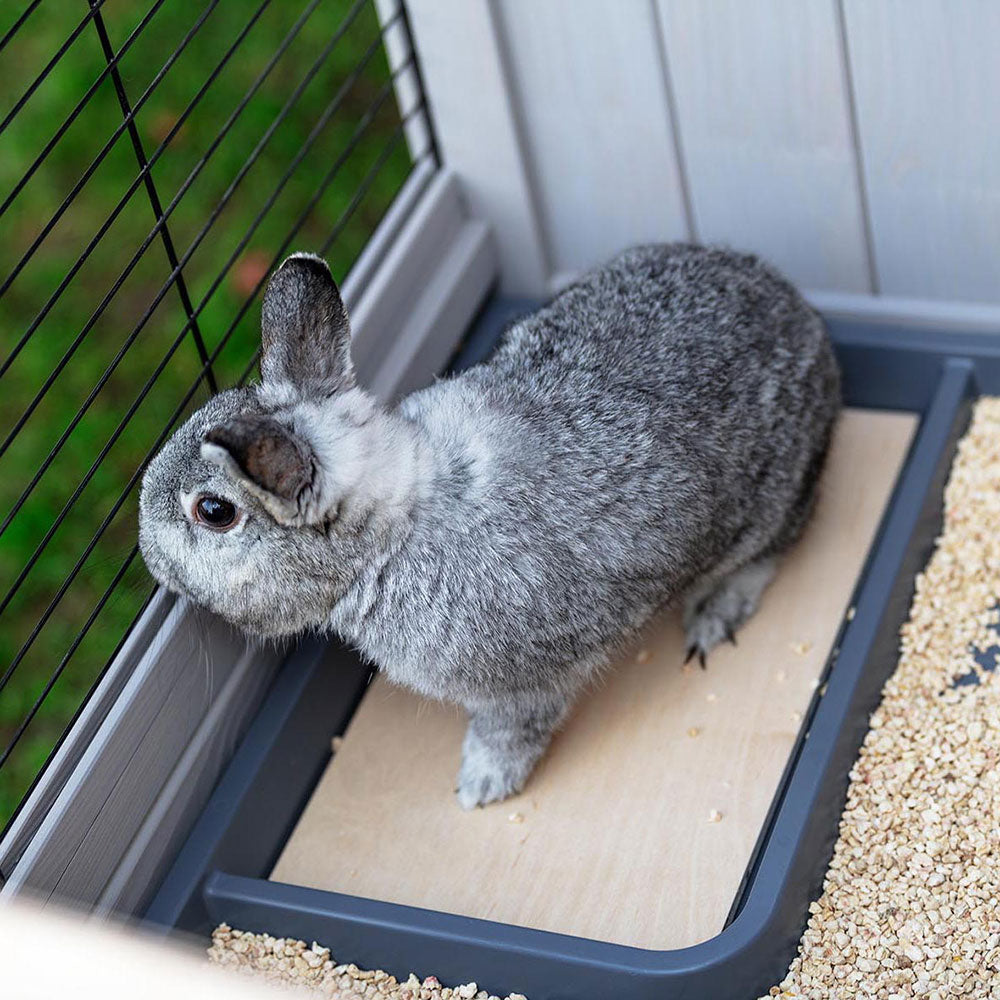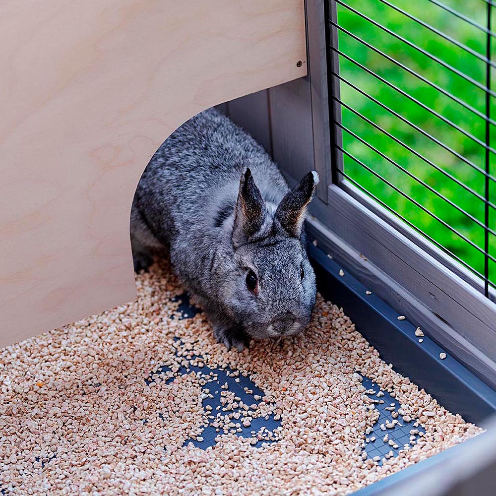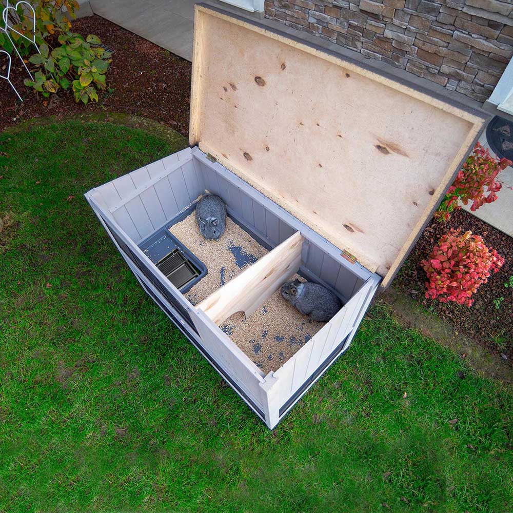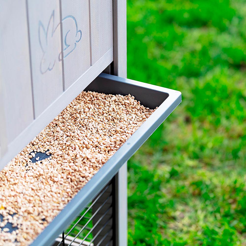 Concernant l’entretien, le toit s'ouvre entièrement pour permettre de sortir facilement le lapin. Pour un nettoyage facile, les deux grands tiroirs sont amovibles et sont cachés par une porte en bois avec fermeture. L’ouverture permet d’accéder à l’étage inférieur, livré avec couvercle, très pratique lors du nettoyage et pour empêcher que la la litière ne s'échappe.