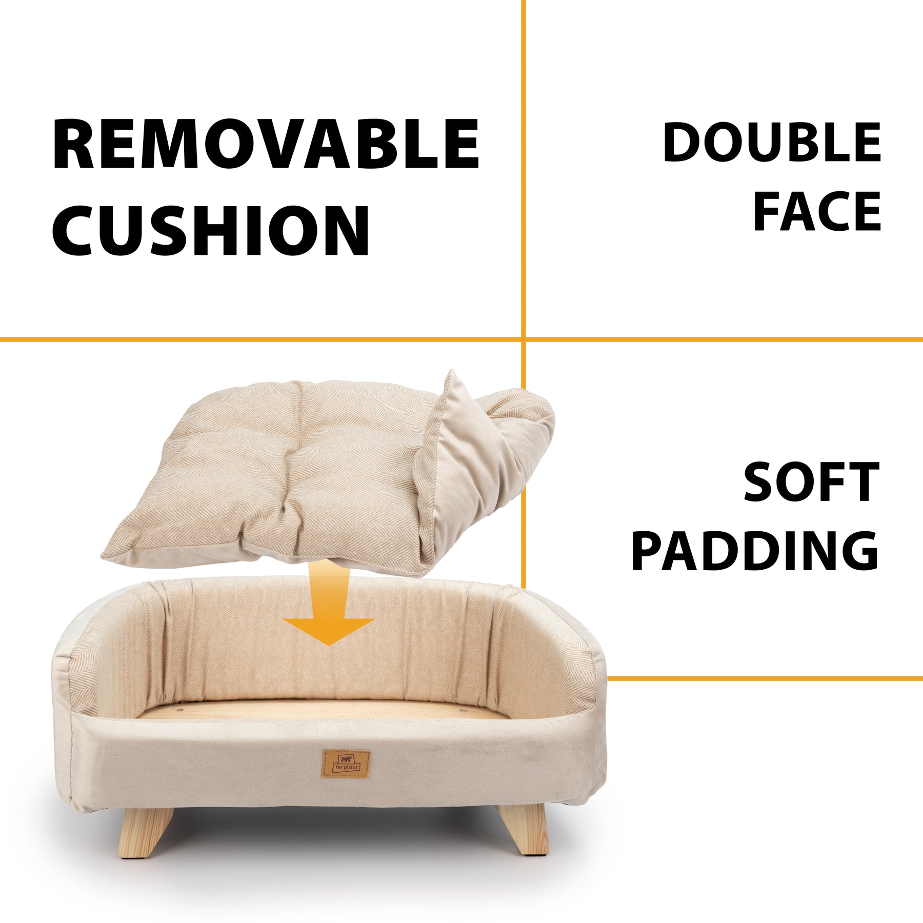Le coussin amovible est réalisé en tissu tweed de grande qualité, agrémenté de détails en velours ton sur ton, pour une sensation de douceur et de raffinement. Le rembourrage offre un appui plaisant et peut être lavé à basse température (30 °C), vous assurant hygiène et facilité d’entretien.